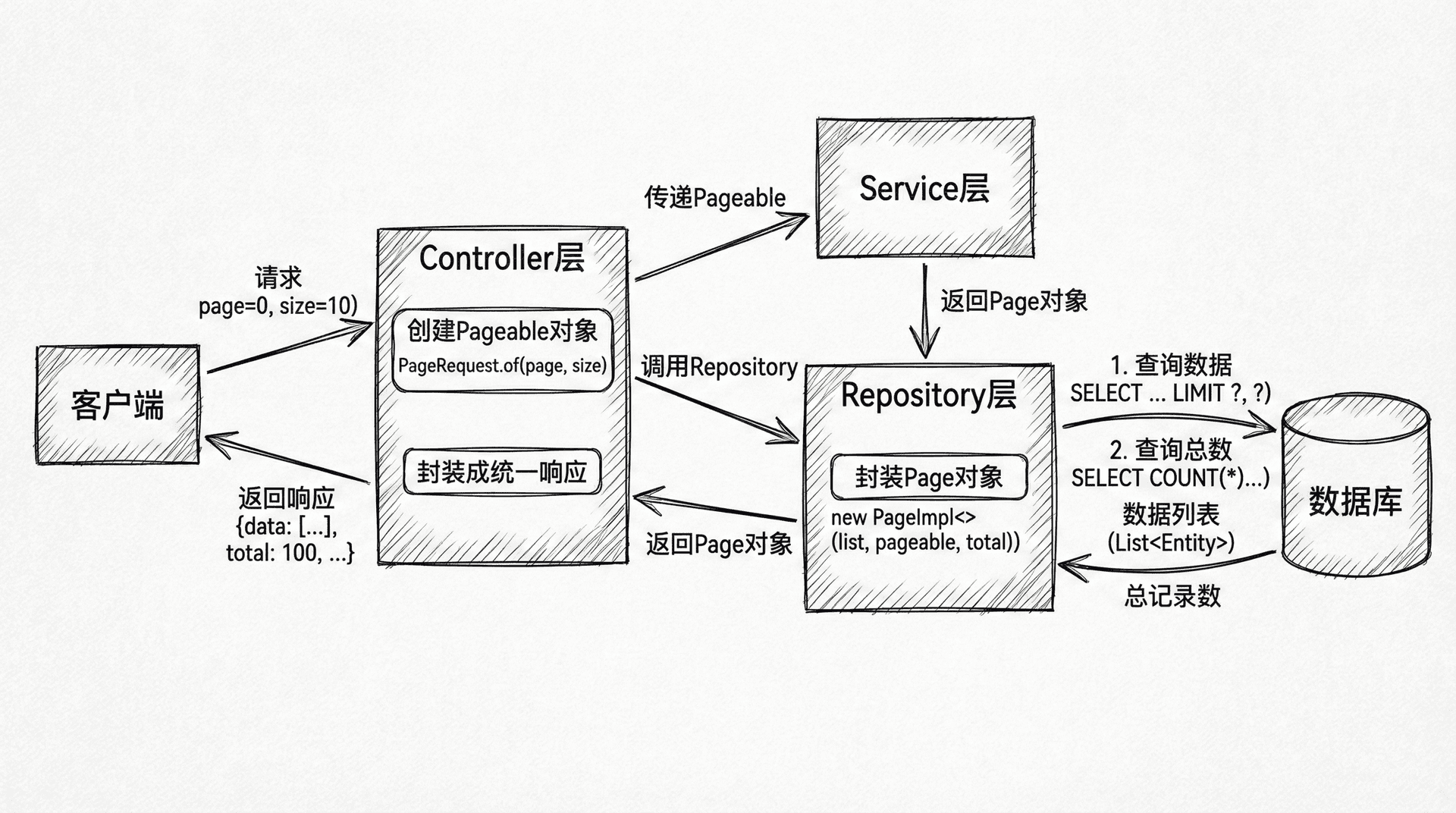 Pageable接口封装了分页信息,包括页码、每页大小、排序信息等。Page接口不仅包含当前页的数据,还包含总记录数、总页数、是否有上一页和下一页等分页元信息。使用分页查询时,Spring Data JPA会自动执行两条SQL:一条查询数据,一条统计总数。