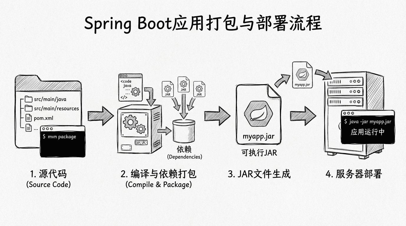 Spring Boot应用可以打包成可执行的JAR文件,这个JAR文件包含了应用的所有依赖和嵌入式服务器,可以直接运行。Maven的spring-boot-maven-plugin插件会自动处理打包过程,你只需要运行Maven命令即可。