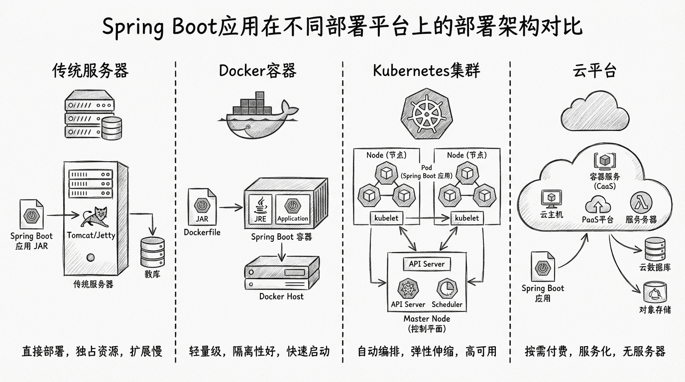容器化部署已经成为现代应用部署的标准方式,它提供了环境一致性、资源隔离、易于扩展等优势。Docker是最流行的容器化平台,Spring Boot应用可以很容易地容器化。
