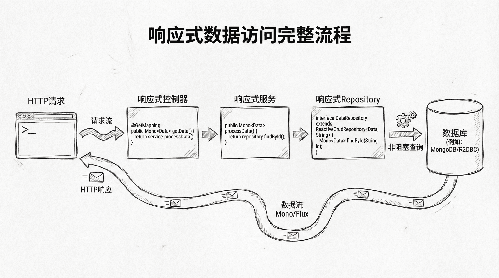 所有操作都是非阻塞的,返回的是响应式类型。这种方式让整个数据访问链路都是响应式的,从HTTP请求到数据库查询,没有任何阻塞操作。