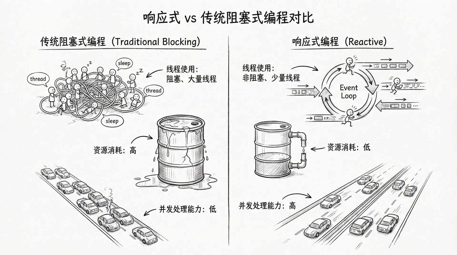 响应式编程特别适合高并发、高吞吐量的场景,但它也有学习曲线。在决定是否使用响应式编程时,需要权衡性能提升和代码复杂度。对于大多数应用,传统的阻塞式模型已经足够,但对于需要处理大量并发连接或实时数据流的应用,响应式编程能够带来显著的性能提升。