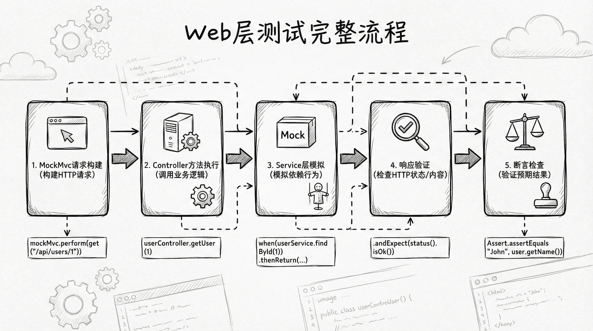 mockMvc.perform()用于执行HTTP请求,andExpect()用于验证响应。jsonPath()用于验证JSON响应的内容,使用JSONPath表达式来定位和验证JSON字段。这种方式让你能够全面测试控制器的各种场景,包括正常流程和异常流程。