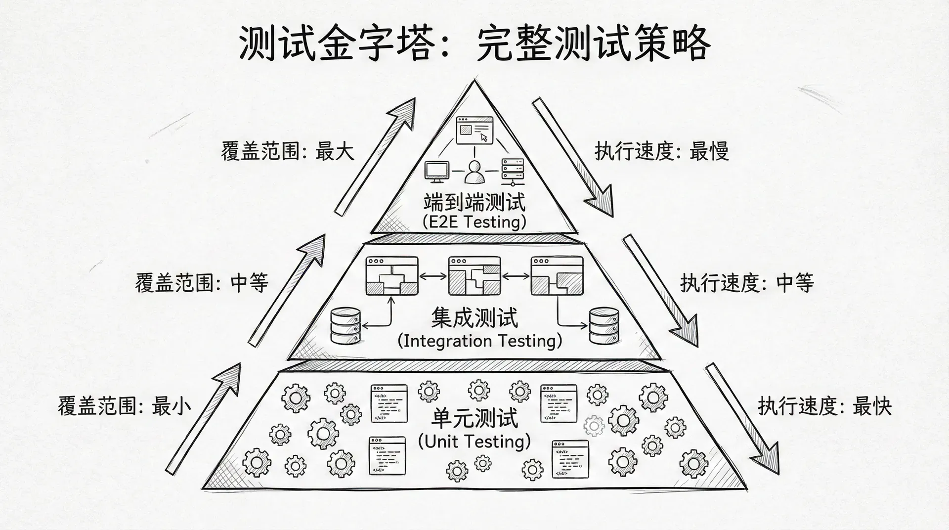 在开始编写测试之前,我们需要理解测试金字塔的概念。测试金字塔将测试分为三个层次:单元测试位于底层,数量最多,运行最快;集成测试位于中间层,数量适中,运行速度中等;端到端测试位于顶层,数量最少,运行最慢。这种分层结构让你能够在测试覆盖率和执行效率之间找到平衡。