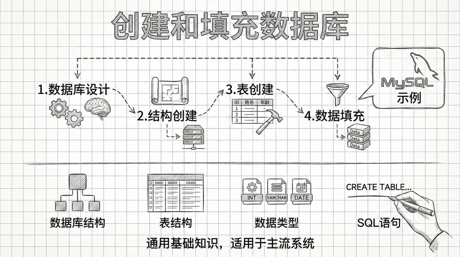 这里我们将系统讲解数据库的创建流程、表结构设计、表的创建方法,以及常用数据类型的选择与应用。 我们将以 MySQL 作为主要示例数据库,因其为当前主流的开源关系型数据库之一,且相关知识同样适用于其他主流数据库系统。
