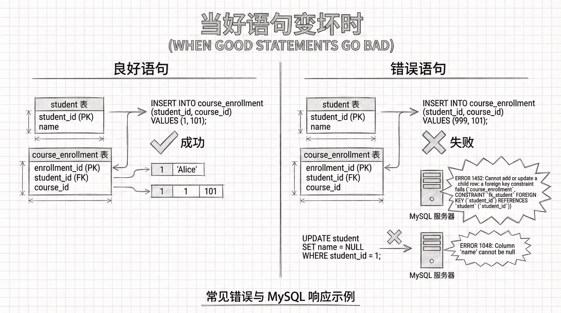 到目前为止,我们现在学习的所有 SQL 数据语句都是格式良好的,并且遵守了规则。但是,基于 student 和 course_enrollment 表的表定义,在插入或修改数据时有很多方法可能会出错。所以我们展示一些常见的错误以及 MySQL 服务器将如何响应。
