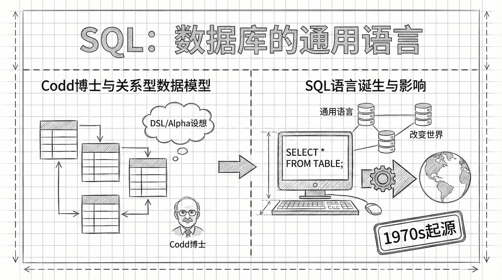 当Codd博士提出关系型数据模型时,他同时设想了一种名为DSL/Alpha的语言来操作这些表格数据。但真正改变世界的,是基于这个设想而诞生的SQL语言。
