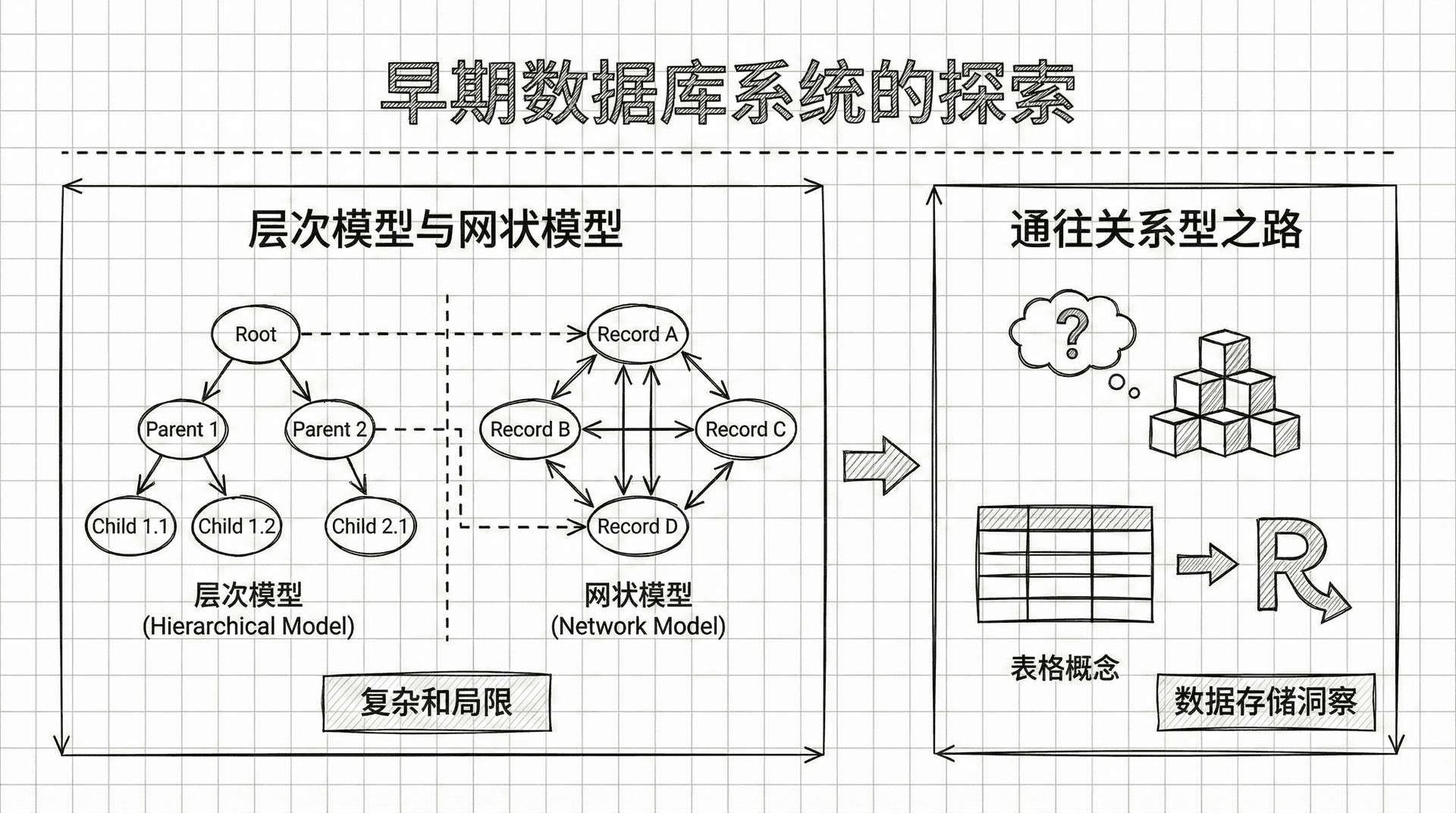 虽然层次型和网络型数据库在某些领域仍然有应用(比如文件系统和目录服务),但它们的复杂性和使用难度促使人们寻找更简单、更直观的数据组织方式。