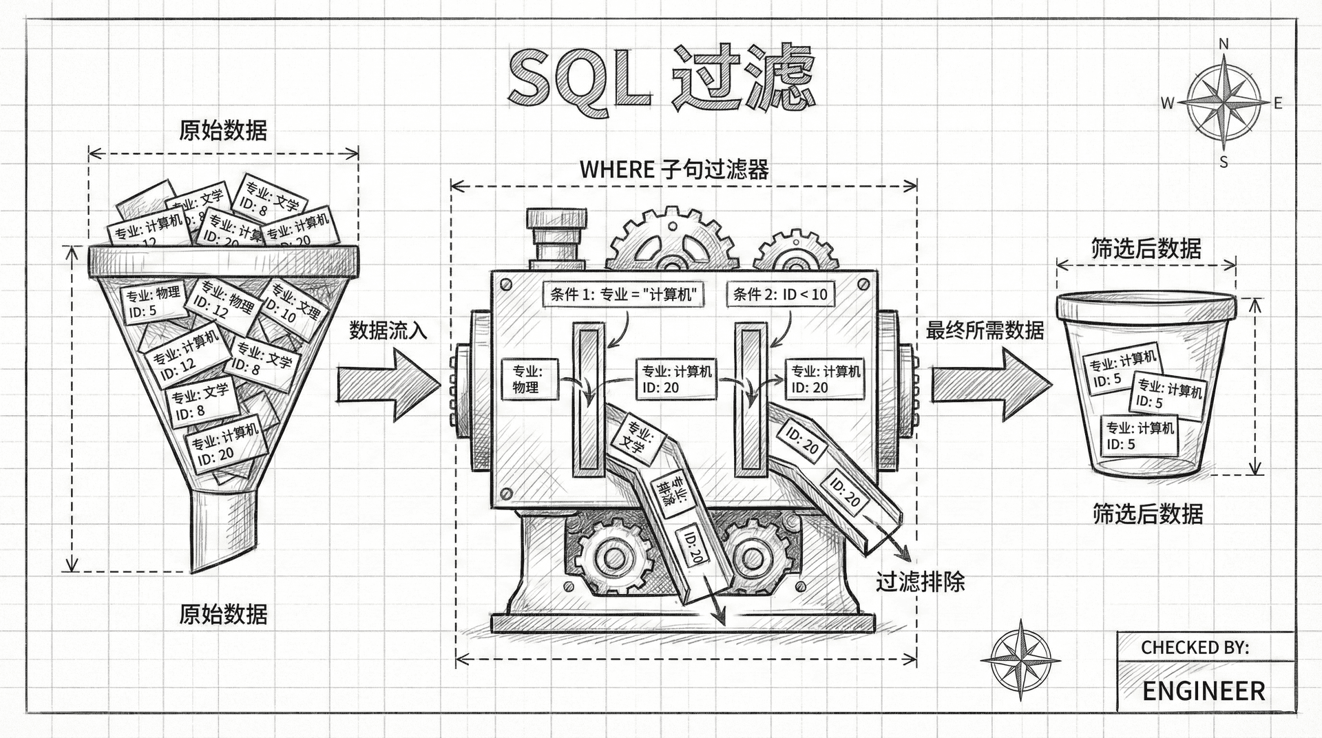 想象一下,你有一个学生信息表,里面包含全校几千名学生的信息。如果你只想查找计算机专业的学生,或者只想找2020年入学的新生,这时候就需要使用过滤条件来缩小查询范围。