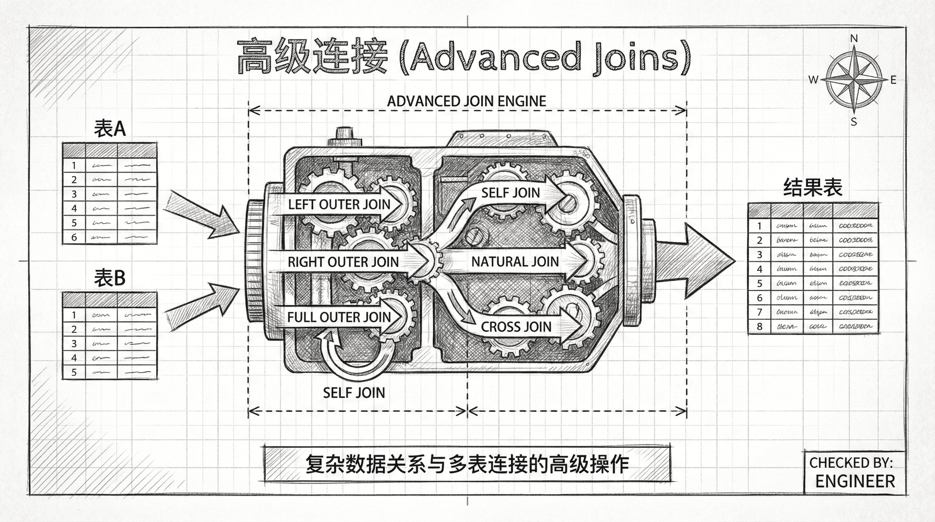 在前面的学习里,我们已经熟悉了内连接的基本概念。但是在实际的数据库操作中,只有一个内连接是远远不够的,我们经常会遇到更复杂的连接需求。 所以接下来,我们将深入探讨其他几种重要的连接类型,包括外连接、交叉连接和自然连接,这些技巧将让你的 SQL 查询更加灵活。