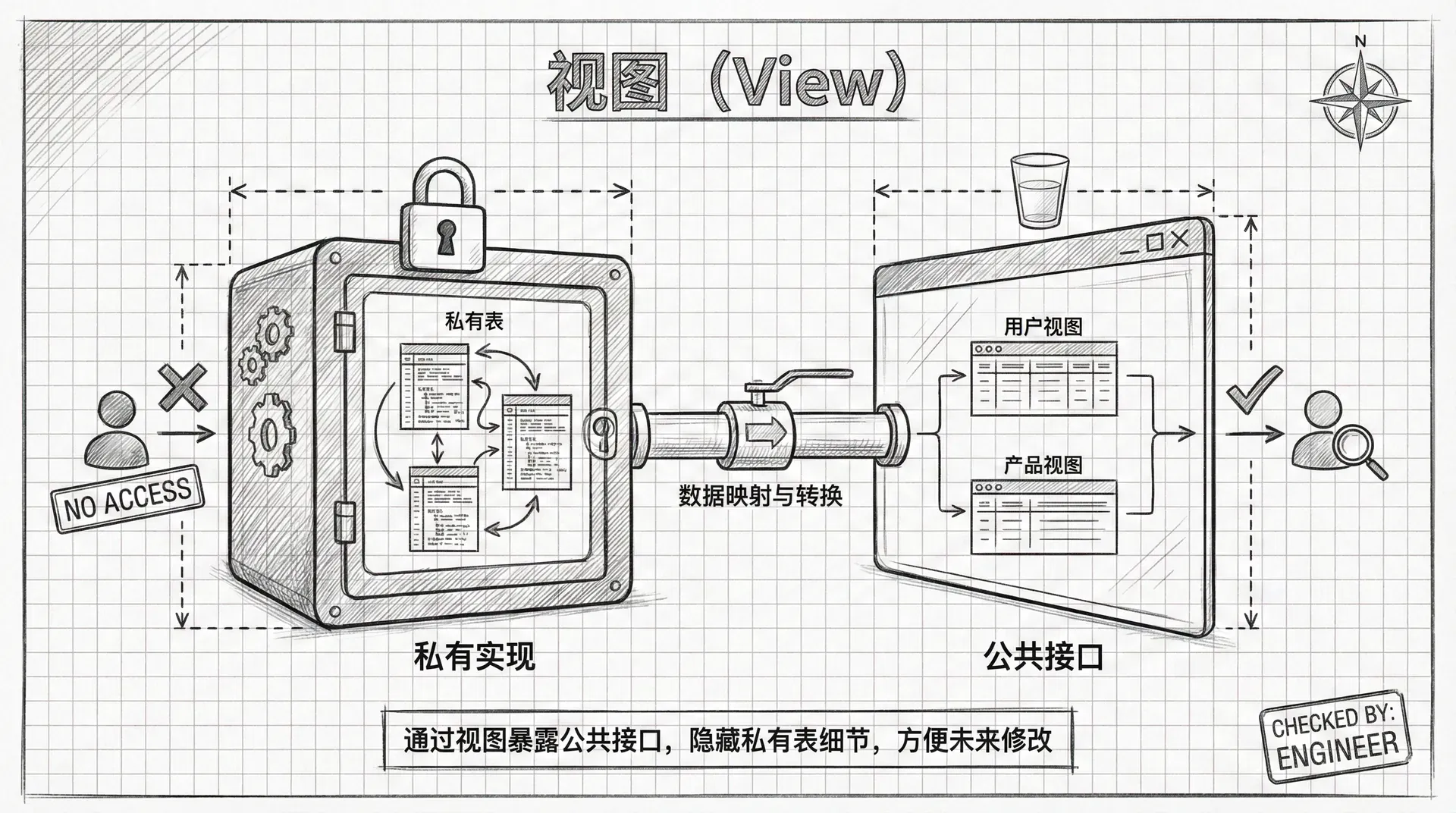 在设计应用程序时,我们通常会暴露公共接口而隐藏实现细节,这样可以在不影响最终用户的情况下进行未来的设计更改。 在数据库设计中,我们可以通过保持表的私有性,并只允许用户通过一组视图来访问数据,从而实现类似的效果。