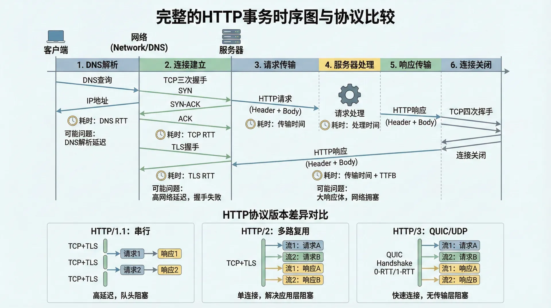 HTTP事务的完整生命周期包括连接建立、请求构建、请求发送、服务器处理、响应构建、响应发送等多个阶段。现代HTTP实现通过各种优化机制,如连接复用、请求流水线、响应压缩等,来减少事务的总体延迟。