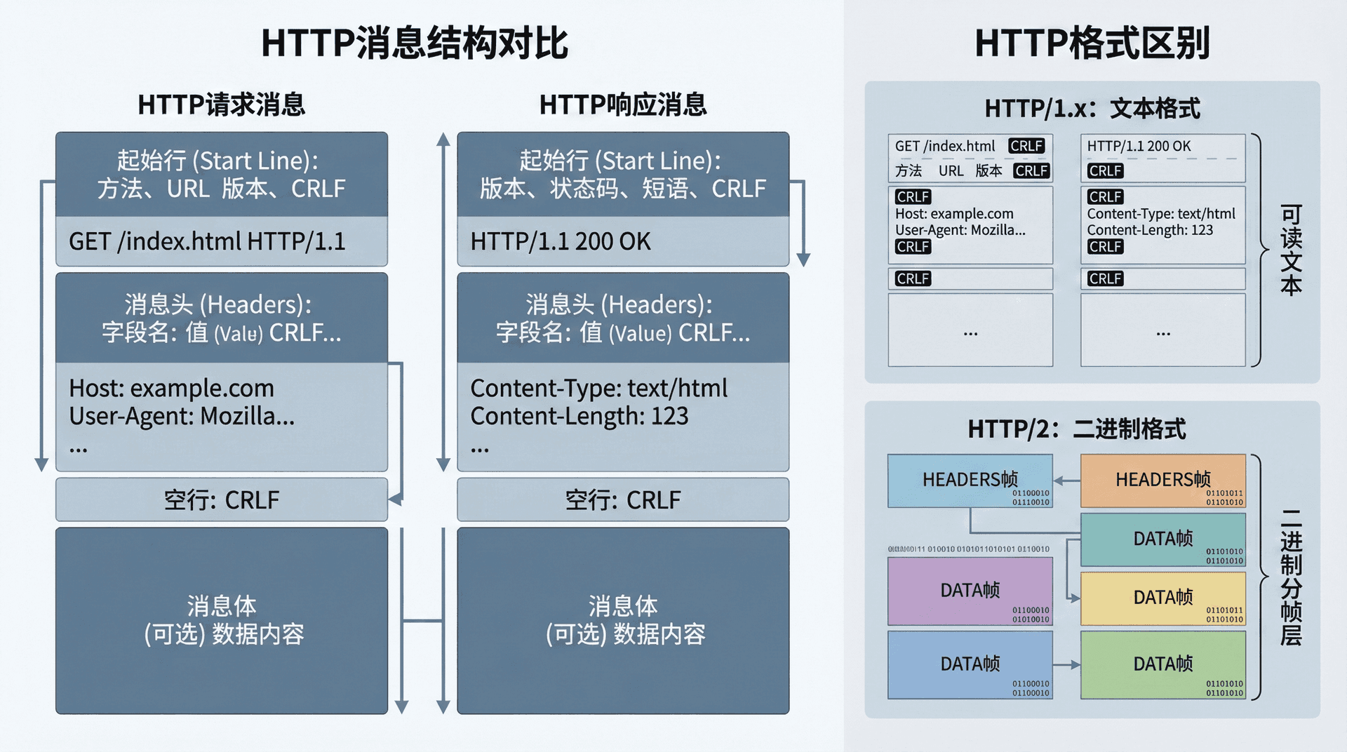 随着互联网的快速发展,HTTP/1.x的文本特性也成为了性能瓶颈。每个HTTP消息都需要进行文本解析,这增加了CPU的负担。更重要的是,文本编码使得消息体积较大,在网络传输中占用了更多的带宽。为了解决这些问题,HTTP/2引入了二进制分帧机制,将消息封装在二进制帧中,既保持了HTTP的语义,又提高了传输效率。这种演进过程展示了协议设计中的权衡考虑,以及如何在保持向后兼容性的同时进行性能优化。