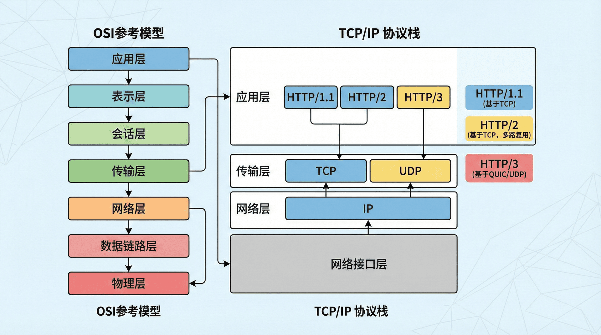 HTTP/3在2022年通过RFC 9114标准化,这是HTTP协议的最新版本。HTTP/3基于QUIC传输协议,QUIC是建立在UDP之上的传输协议,它提供了与TCP类似的可靠性保证,但具有更好的性能特性。HTTP/3的主要优势包括更快的连接建立、更好的移动网络支持、以及从根本上解决了队头阻塞问题。
