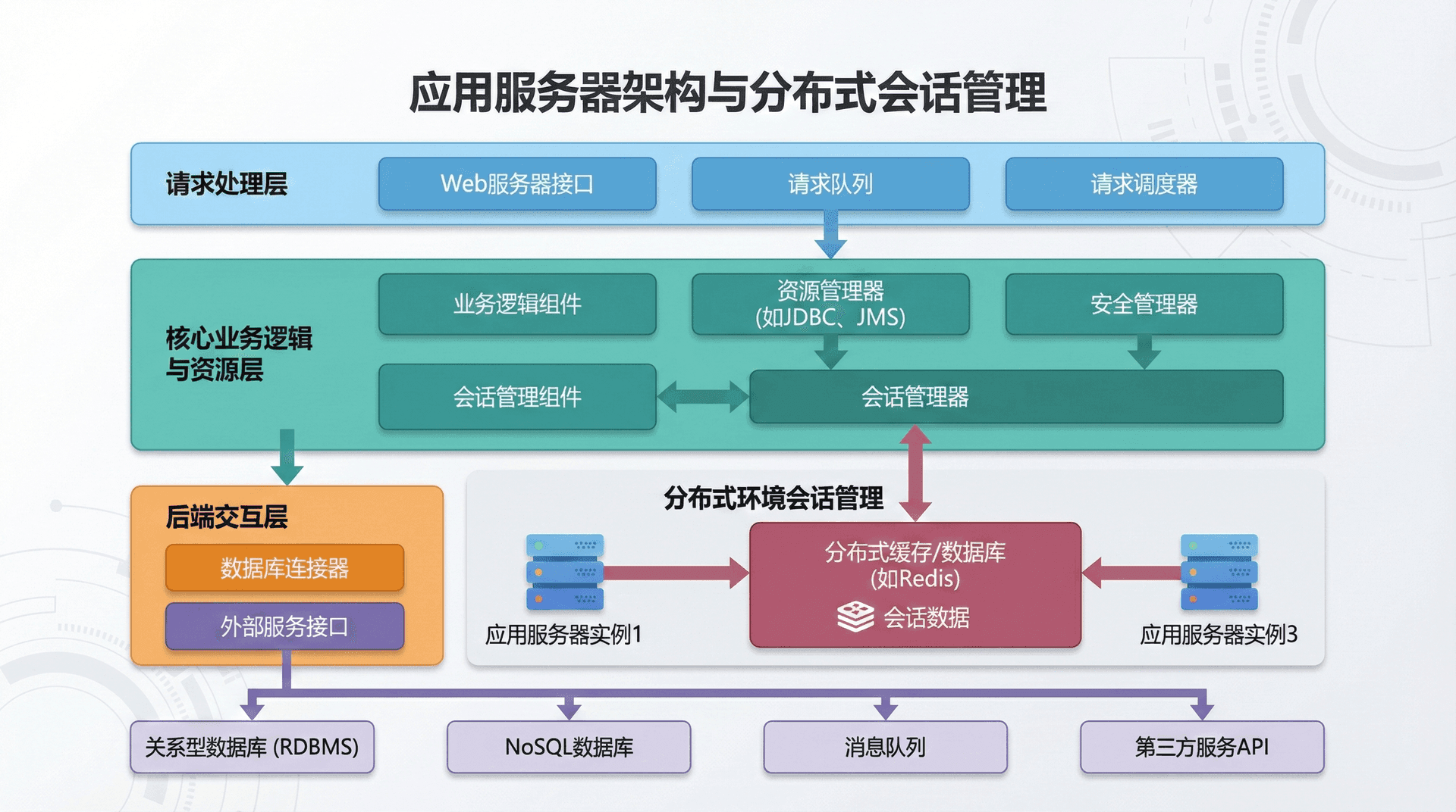 再次是会话管理,应用服务器需要管理用户会话,存储会话数据,处理会话过期等。会话管理可以使用内存存储、数据库存储、分布式缓存存储等不同的方式。会话管理的选择需要考虑性能、可扩展性、一致性等因素。