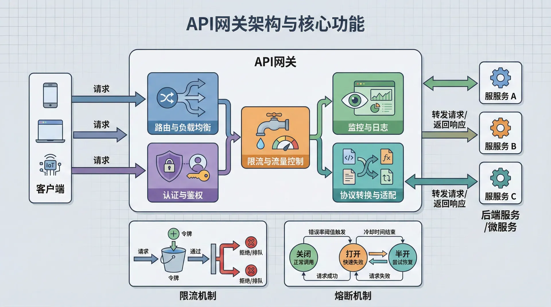 限流和熔断是API网关的重要保护机制。限流可以防止后端服务过载,熔断可以防止级联故障。限流策略应该根据后端服务的容量来设置,熔断策略应该根据服务的健康状态来调整。