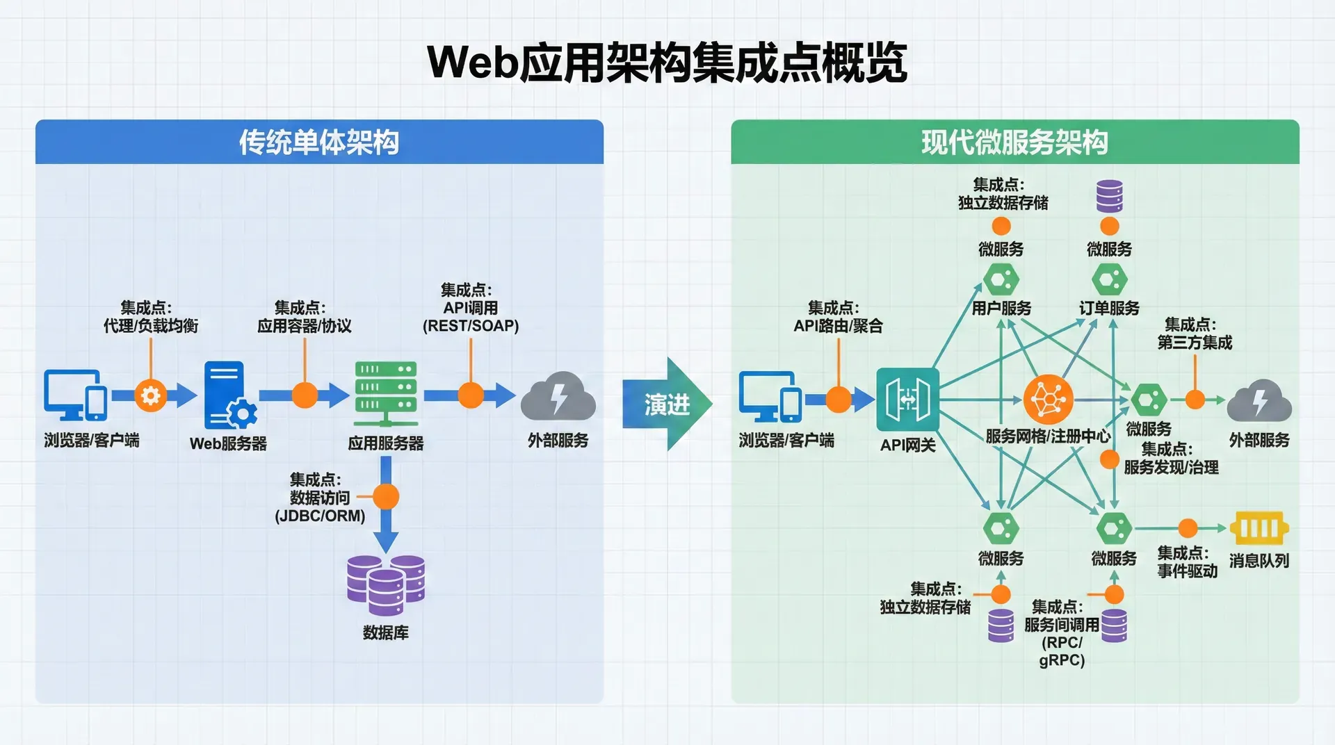 在Web后端架构中,集成点(Integration Points)是不同组件、系统和服务之间进行交互和集成的关键位置。集成点不仅仅是简单的接口连接,它们涉及协议转换、数据格式转换、安全控制、错误处理、性能优化等多个方面。