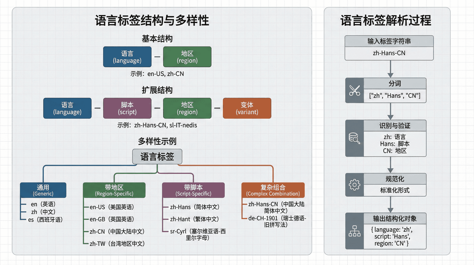语言标签还可以包含更多信息,如脚本、变体等。例如,zh-Hans-CN表示简体中文(中国大陆),其中Hans表示简体中文脚本。语言标签的解析需要遵循BCP 47的规则,正确处理各种格式和变体。