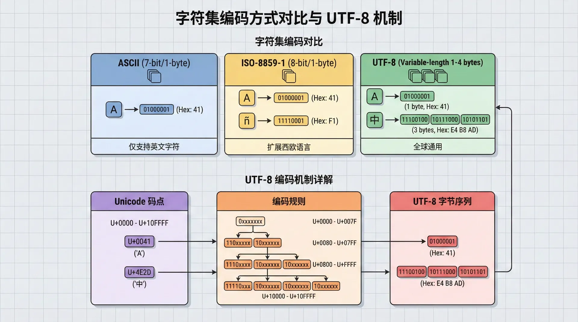 UTF-8是Unicode最常用的编码方案,它使用可变长度编码,英文字符占用1个字节,中文字符占用3个字节。UTF-8的优势在于它向后兼容ASCII,ASCII字符的UTF-8编码与ASCII编码相同。UTF-8还具有良好的网络传输特性,因为它不包含字节序标记,可以在不同字节序的系统之间传输。