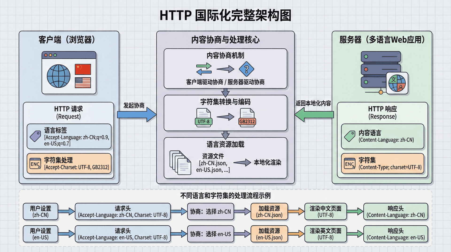 HTTP国际化(Internationalization,i18n)是Web应用支持多语言、多地区、多字符集的重要机制。国际化不仅仅是简单的翻译,它涉及字符编码、文本方向、日期格式、数字格式、货币格式等多个方面。