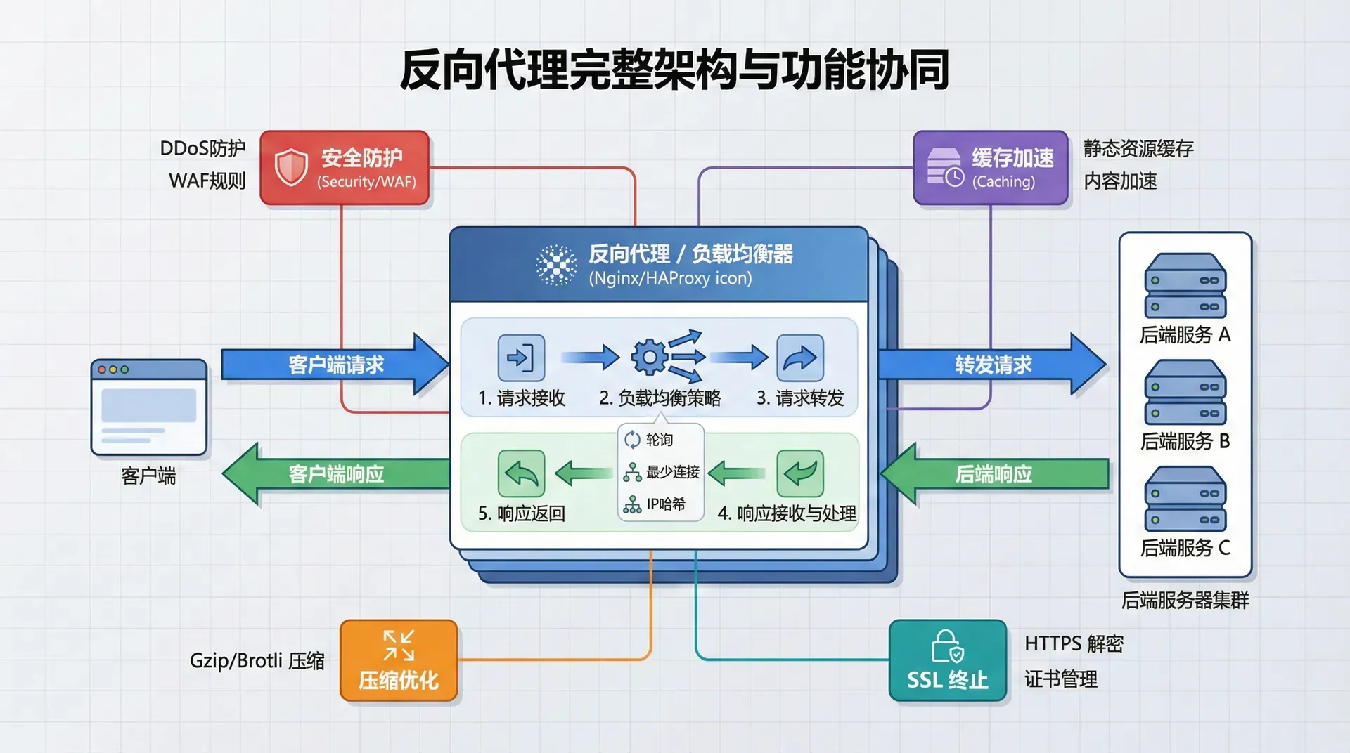反向代理是负载均衡的一种实现方式,它位于客户端和服务器之间,接收客户端的请求,然后将请求转发到后端服务器。反向代理不仅可以实现负载均衡,还可以提供多种功能,如缓存、SSL终止、请求路由、安全过滤等。