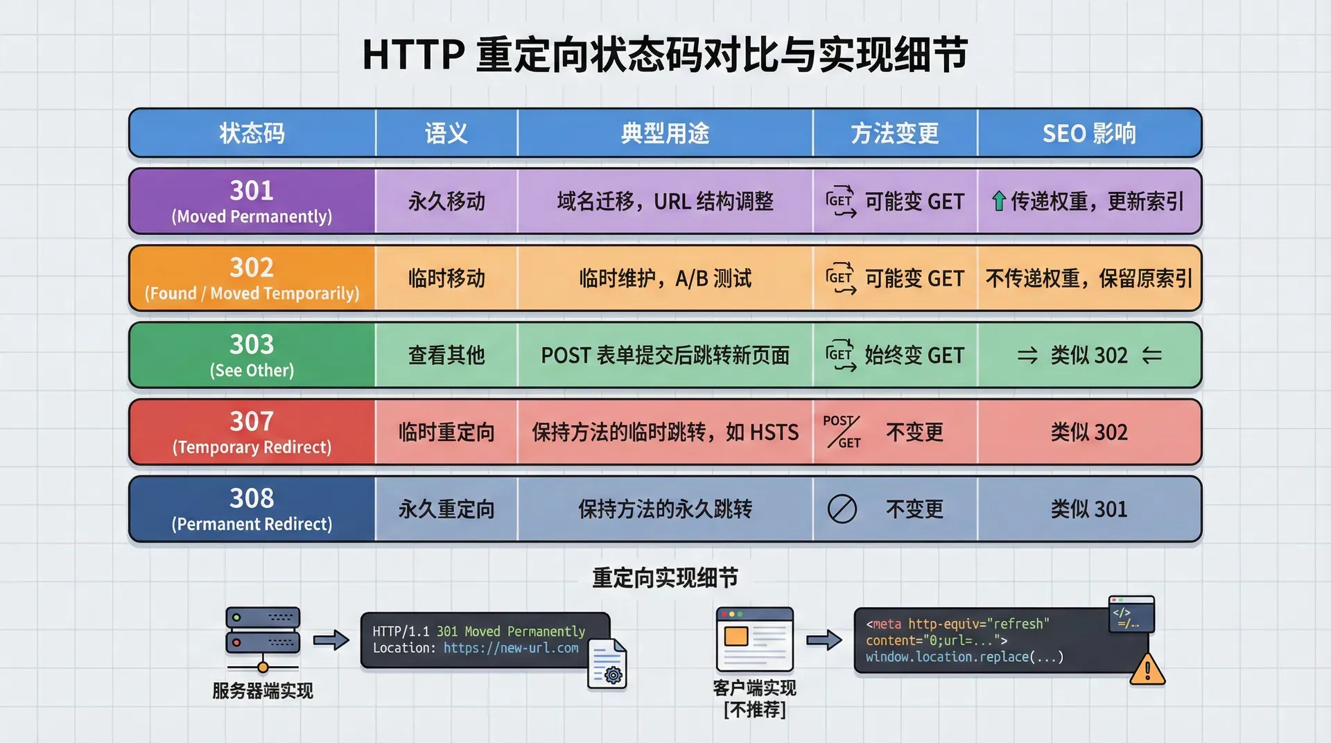 301和308都是永久重定向,但它们有细微的区别。301允许浏览器将POST请求转换为GET请求,而308要求保持原始的HTTP方法。对于需要保持请求方法的场景,应该使用308而不是301。理解这些区别对于正确使用重定向非常重要。