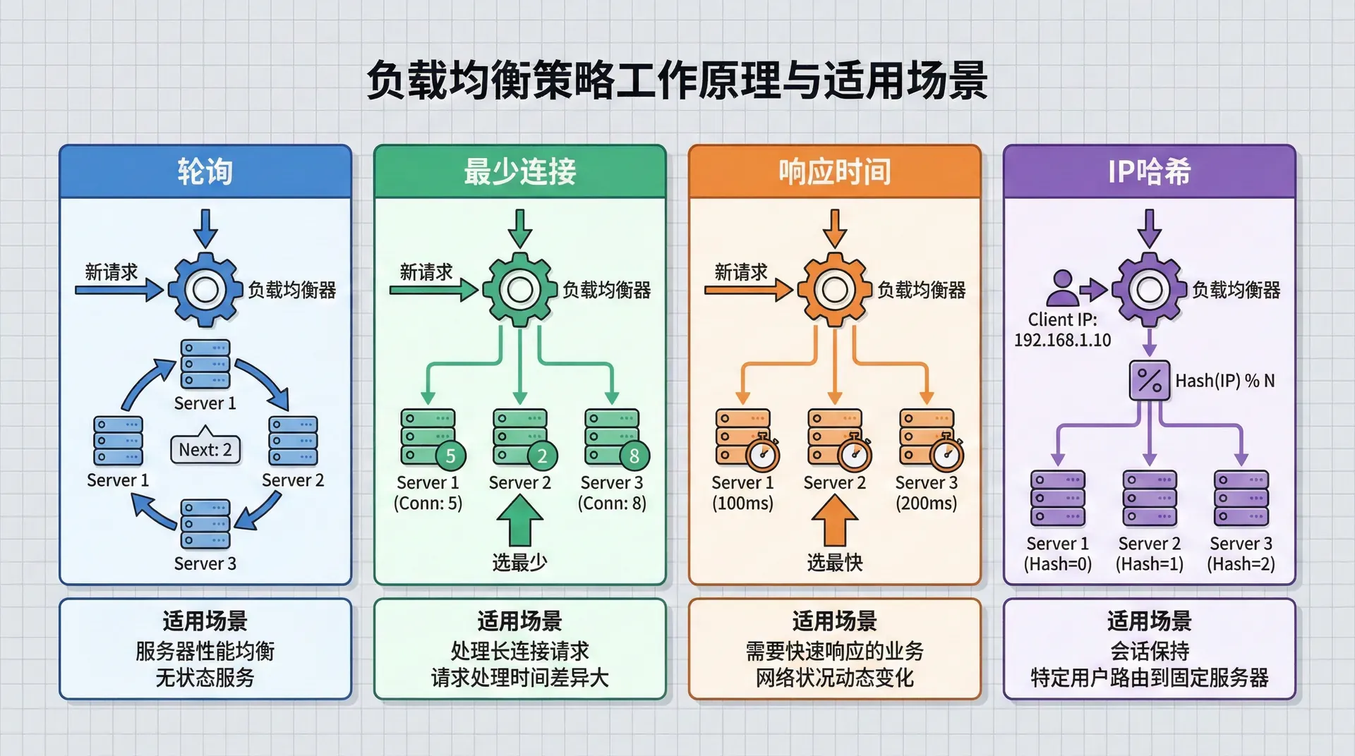 负载均衡算法的优化对于提高系统性能至关重要。不同的负载均衡算法适用于不同的场景,需要根据应用的特点来选择。轮询算法适合服务器性能相近的场景,最少连接算法适合长连接场景,响应时间算法适合追求最快响应的场景,IP哈希算法适合需要会话粘性的场景。理解这些算法的特点和适用场景对于正确选择负载均衡算法非常重要。