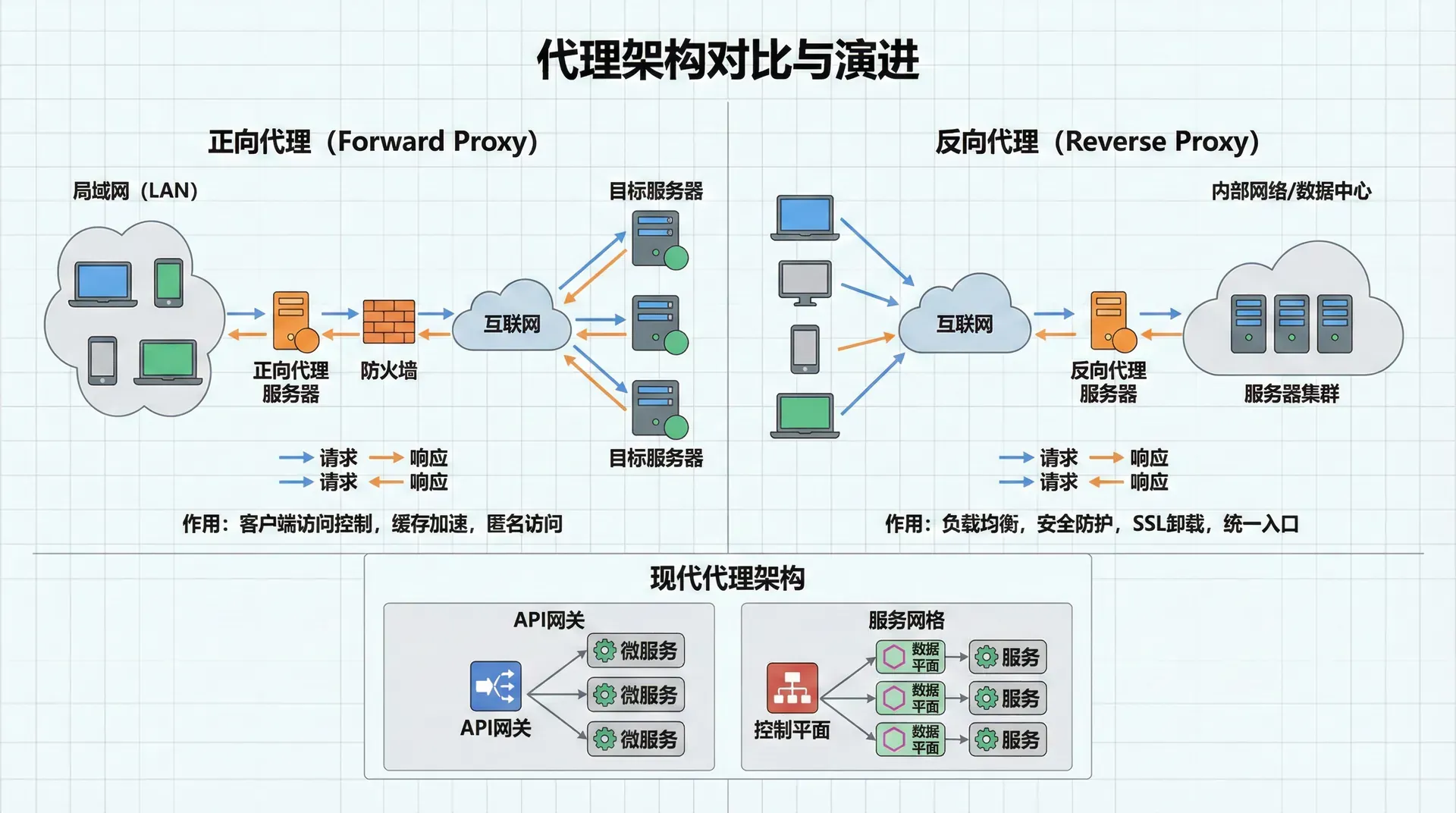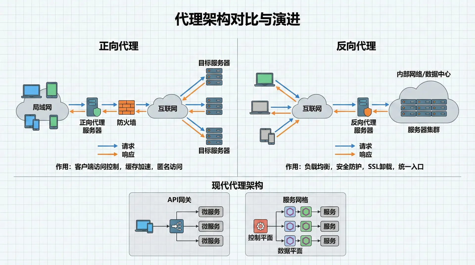 现代Web架构中,代理的作用越来越重要。在微服务架构中,API网关作为反向代理,提供统一的路由、认证、限流等功能。在云原生架构中,服务网格(Service Mesh)使用代理来实现服务之间的通信和管理。在边缘计算中,边缘代理可以提供内容分发、安全防护等功能。