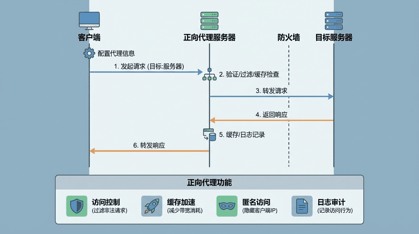 正向代理的一个典型应用场景是企业网络。企业可以部署正向代理,所有内部用户的网络请求都通过代理。这可以实现统一的安全策略、内容过滤、访问日志等。正向代理还可以缓存常用的外部资源,减少外部带宽的使用,提高访问速度。企业正向代理通常还提供用户认证功能,确保只有授权用户可以访问外部资源。