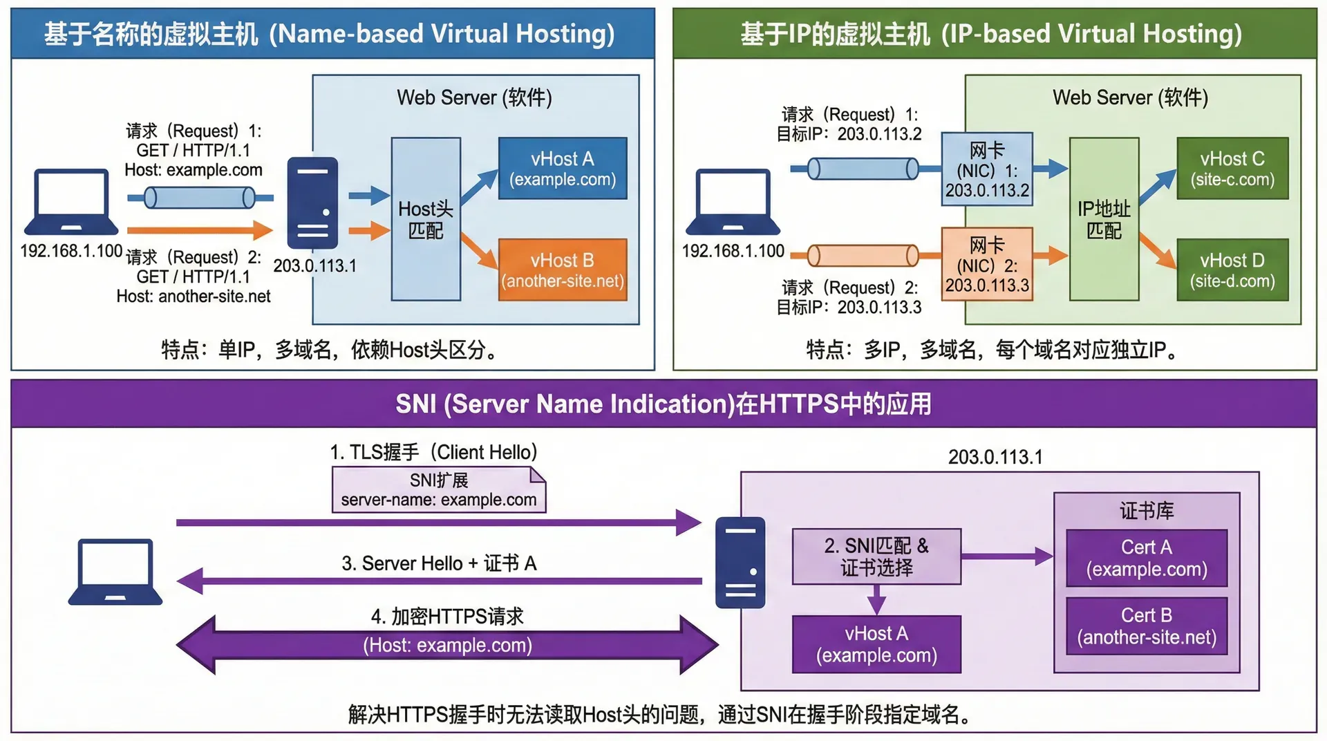 虚拟主机有两种基本类型:基于名称的虚拟主机(Name-based Virtual Hosting)和基于IP的虚拟主机(IP-based Virtual Hosting)。基于名称的虚拟主机使用HTTP Host头来区分不同的网站,多个网站可以共享同一个IP地址和端口。这种方式的优势是资源利用效率高,只需要一个IP地址就可以托管多个网站。然而,这种方式也有一些限制,如某些旧的客户端可能不支持Host头,SSL/TLS证书的配置可能更加复杂。