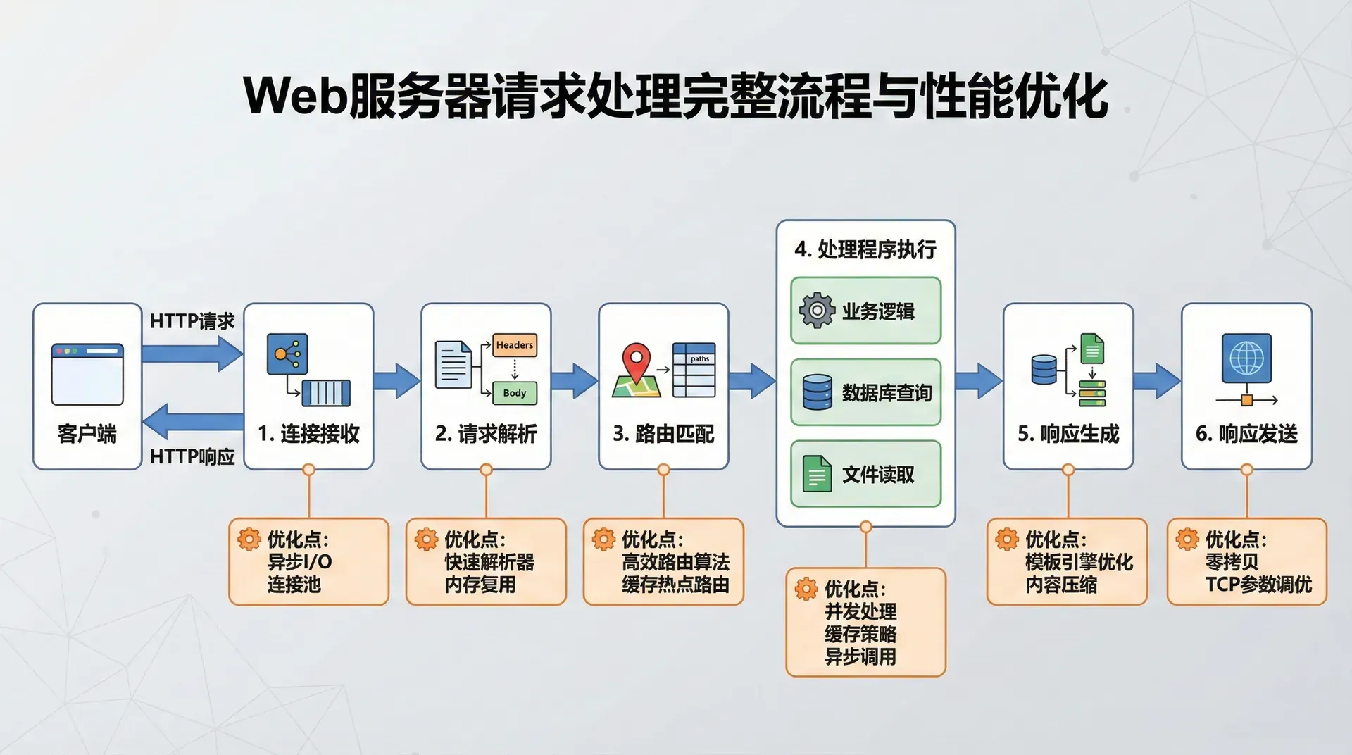请求处理的性能优化涉及多个方面。首先是连接管理,通过连接池、连接复用等技术可以减少连接建立的开销。其次是请求解析,通过优化的解析器、缓冲区的预分配等技术可以提高解析效率。再次是处理程序的执行,通过缓存、异步处理、负载均衡等技术可以提高处理效率。最后是响应的发送,通过压缩、分块传输、HTTP/2等技术可以提高传输效率。