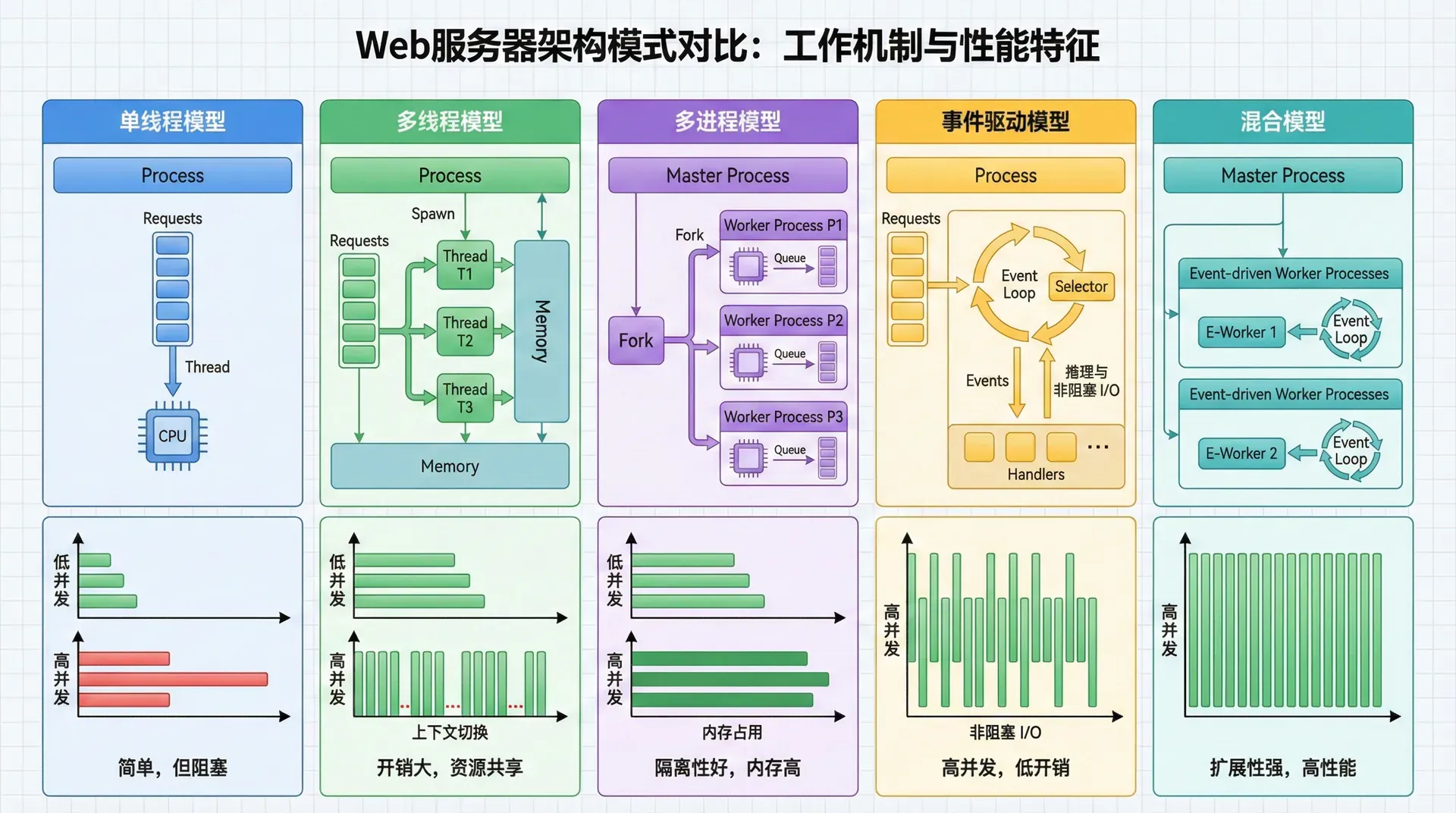 混合模型结合了多种架构模式的优点。例如,可以使用多进程模型来处理请求,每个进程内部使用事件驱动模型来处理连接。这种模型可以在保持进程隔离性的同时,提高每个进程的处理效率。混合模型适用于需要平衡性能和隔离性的场景,是许多现代Web服务器采用的方式。