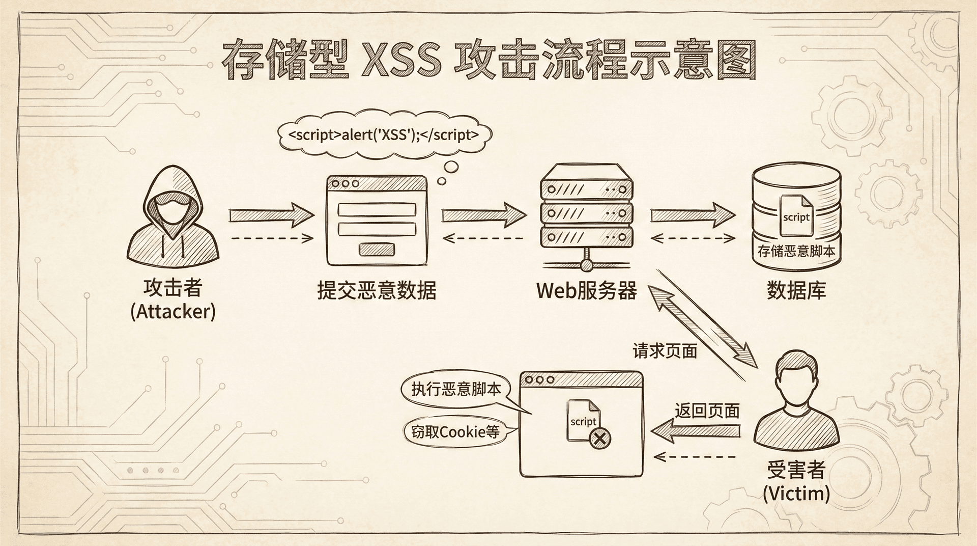 存储型XSS(Stored XSS)是指恶意脚本被存储到服务器(如数据库),每次用户访问相关页面时都会执行。