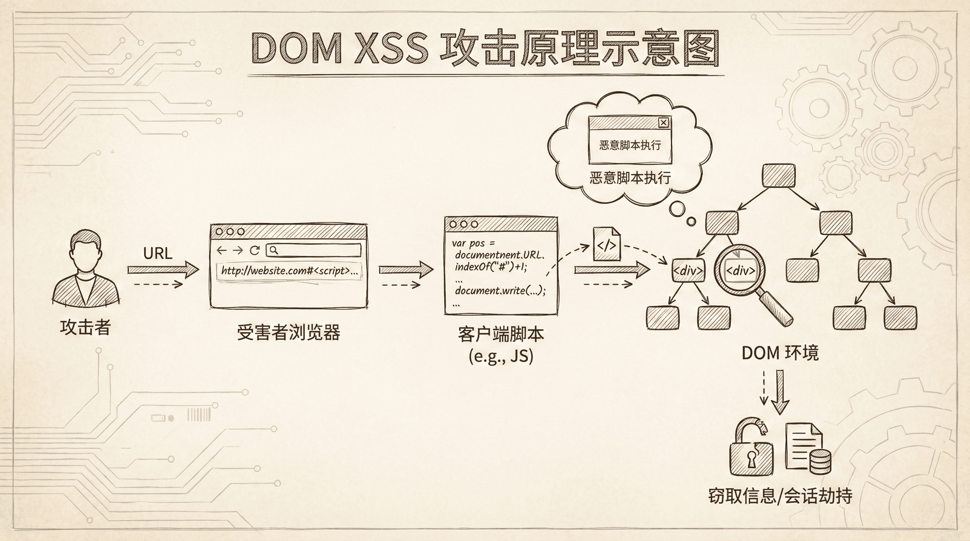 DOM XSS(DOM-based XSS)是指恶意脚本通过修改DOM环境在客户端执行,不经过服务器。