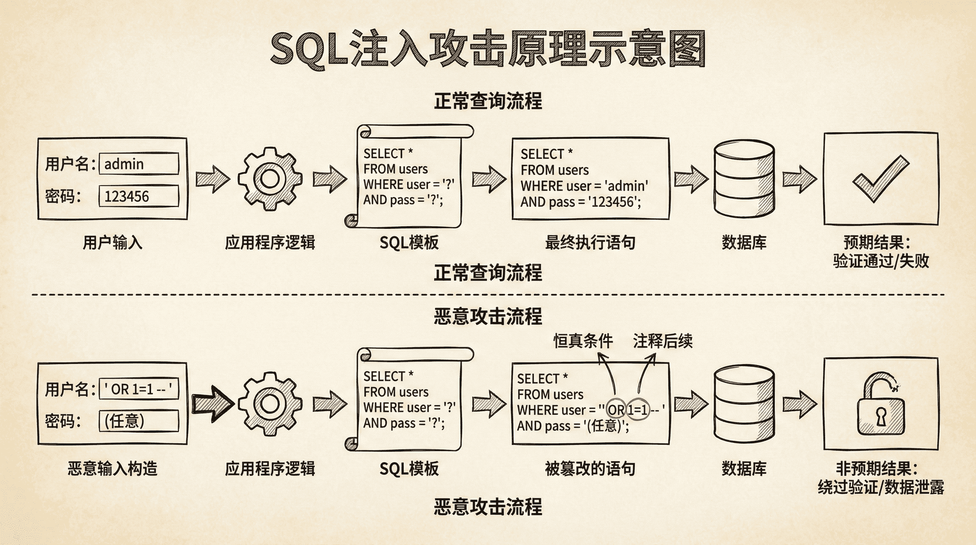 SQL注入(SQL Injection)是指攻击者通过构造恶意的SQL语句,让应用程序执行非预期的SQL查询,从而获取、修改或删除数据库中的数据。