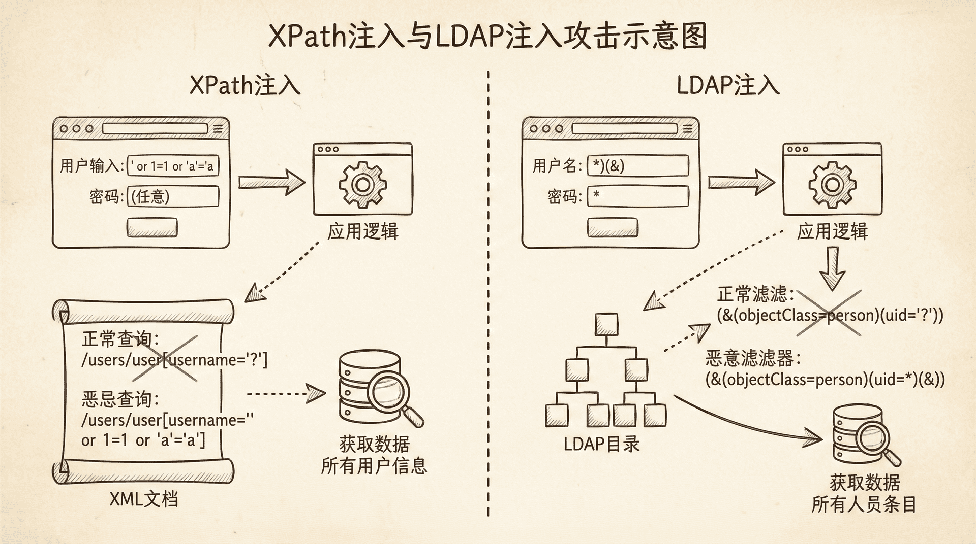 LDAP注入(LDAP Injection)是指攻击者通过构造恶意的LDAP查询,获取目录服务中的数据。