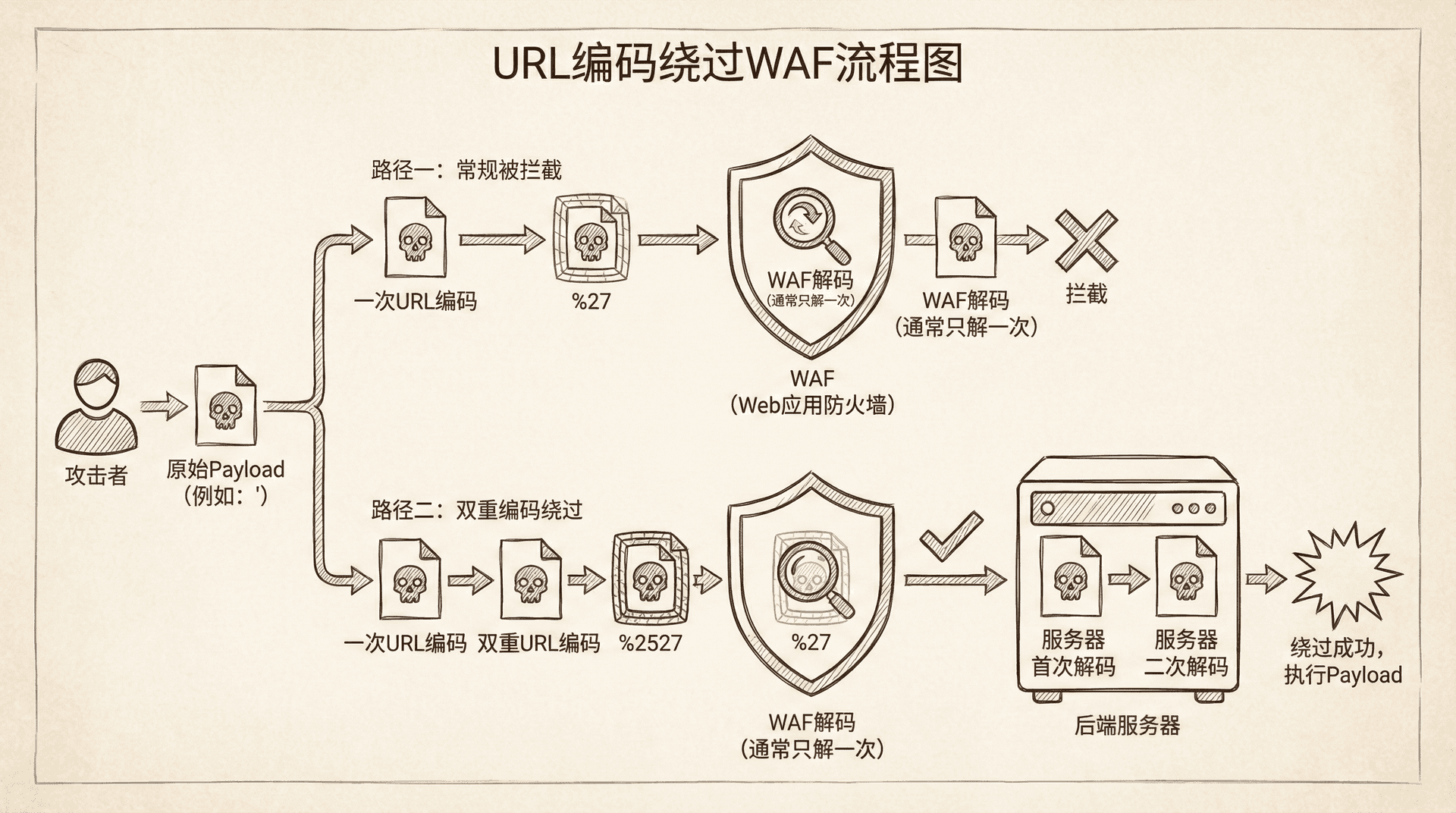 WAF只解码一次,所以%27被解码成',被检测到SQL注入。双重编码后,WAF解码一次得到%27,检测不到SQL注入,因为WAF认为这是编码后的字符,不是SQL注入。但服务器解码两次,得到',成功注入。这说明编码不一致可能导致绕过,WAF和服务器对编码的处理不同,就可能绕过。