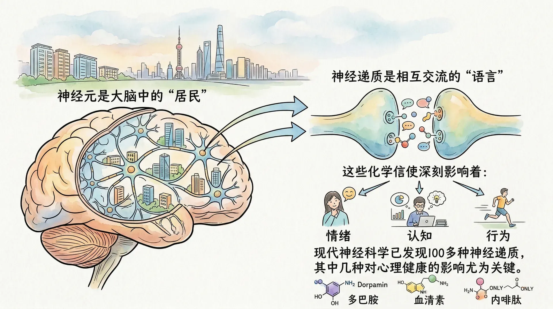 神经元是大脑中的“居民”,神经递质就是它们相互交流的“语言”。这些化学信使在神经元之间传递信息,深刻影响着情绪、认知和行为。现代神经科学已发现100多种神经递质,其中几种对心理健康的影响尤为关键。