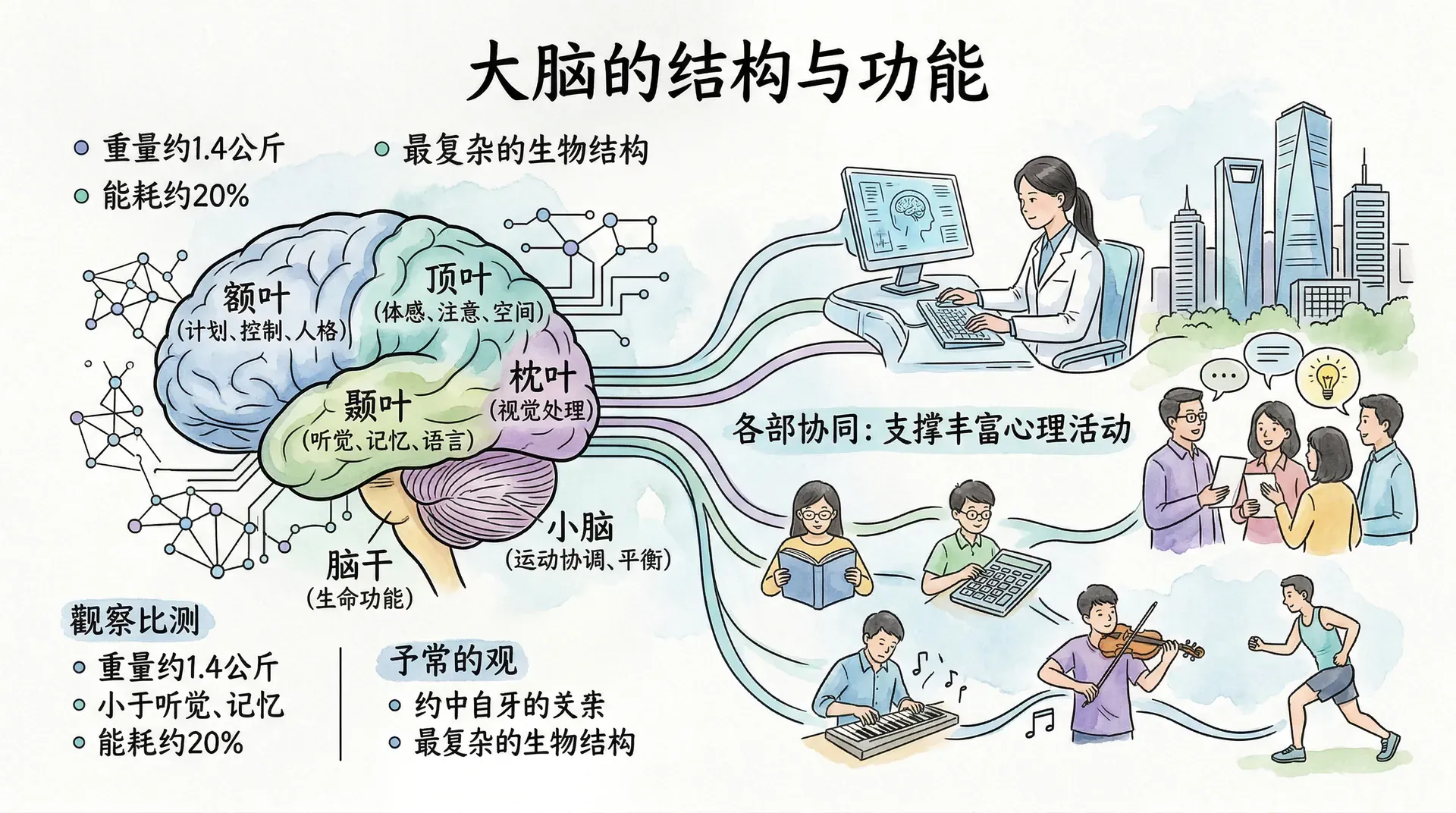 大脑重量约1.4公斤,却消耗人体约20%的能量,是迄今已知最复杂的生物结构。不同脑区负责不同的功能,各部分协同运作,共同支撑起人类丰富的心理活动。
