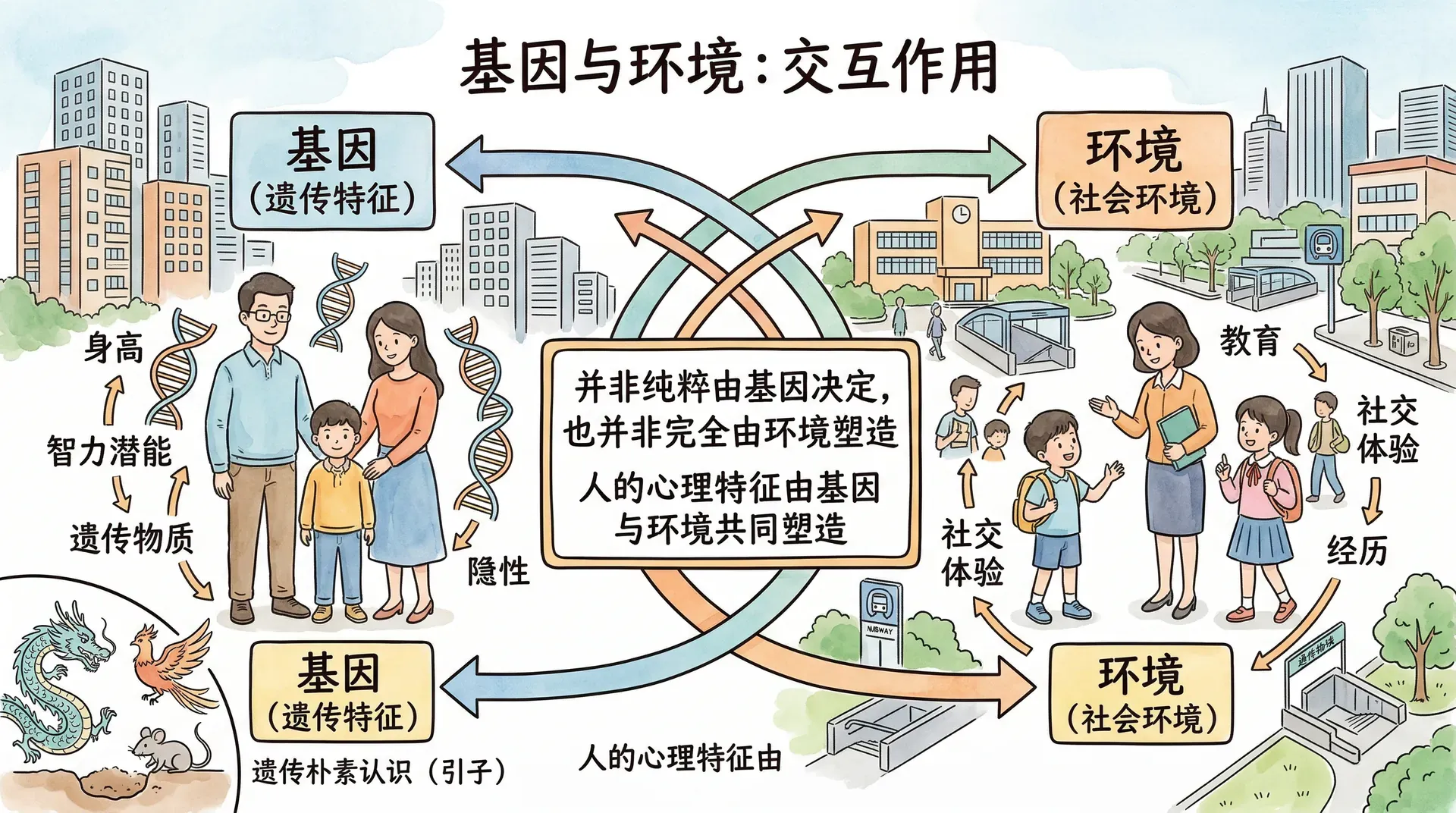 “龙生龙,凤生凤,老鼠的儿子会打洞”——这句俗语反映了人们对遗传作用的朴素认识。现代心理学研究表明,人的心理特征既不是纯粹由基因决定,也不是完全由环境塑造,而是基因与环境复杂交互作用的结果。