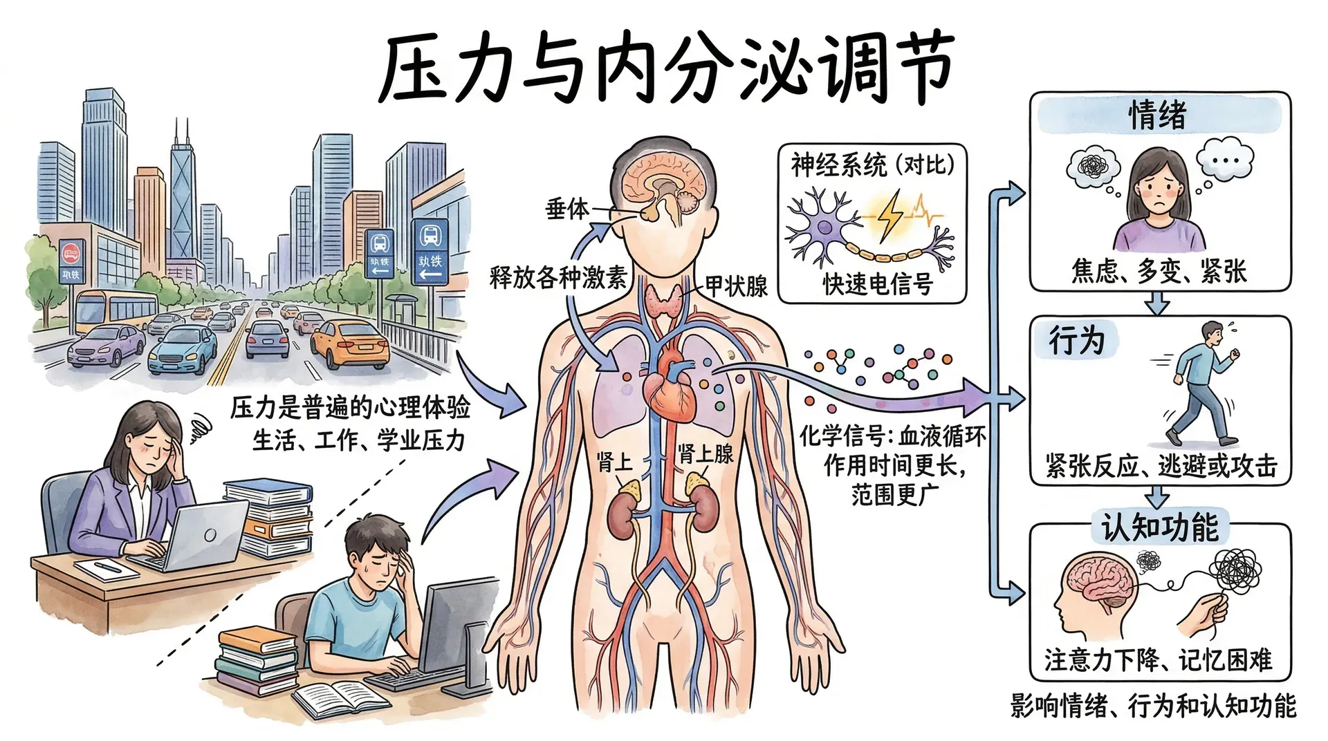 压力是现代人普遍面对的心理体验,而身体对压力的反应远比表面上看到的复杂。内分泌系统通过释放各种激素影响情绪、行为和认知功能,与神经系统的快速电信号不同,激素通过血液循环传递化学信息,作用时间更长、影响范围更广。