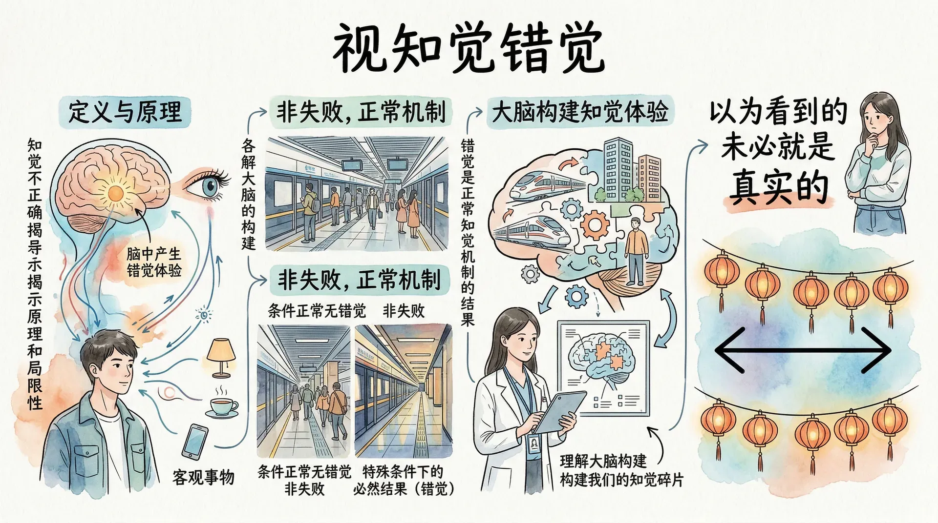 错觉是对客观事物不正确的知觉,它揭示了知觉系统的工作原理和局限性。错觉并非知觉失败,而是正常知觉机制在特殊条件下的必然结果。研究错觉帮助心理学家理解大脑如何构建我们的知觉体验,也让我们认识到:我们以为“看到的”,未必就是“真实的”。