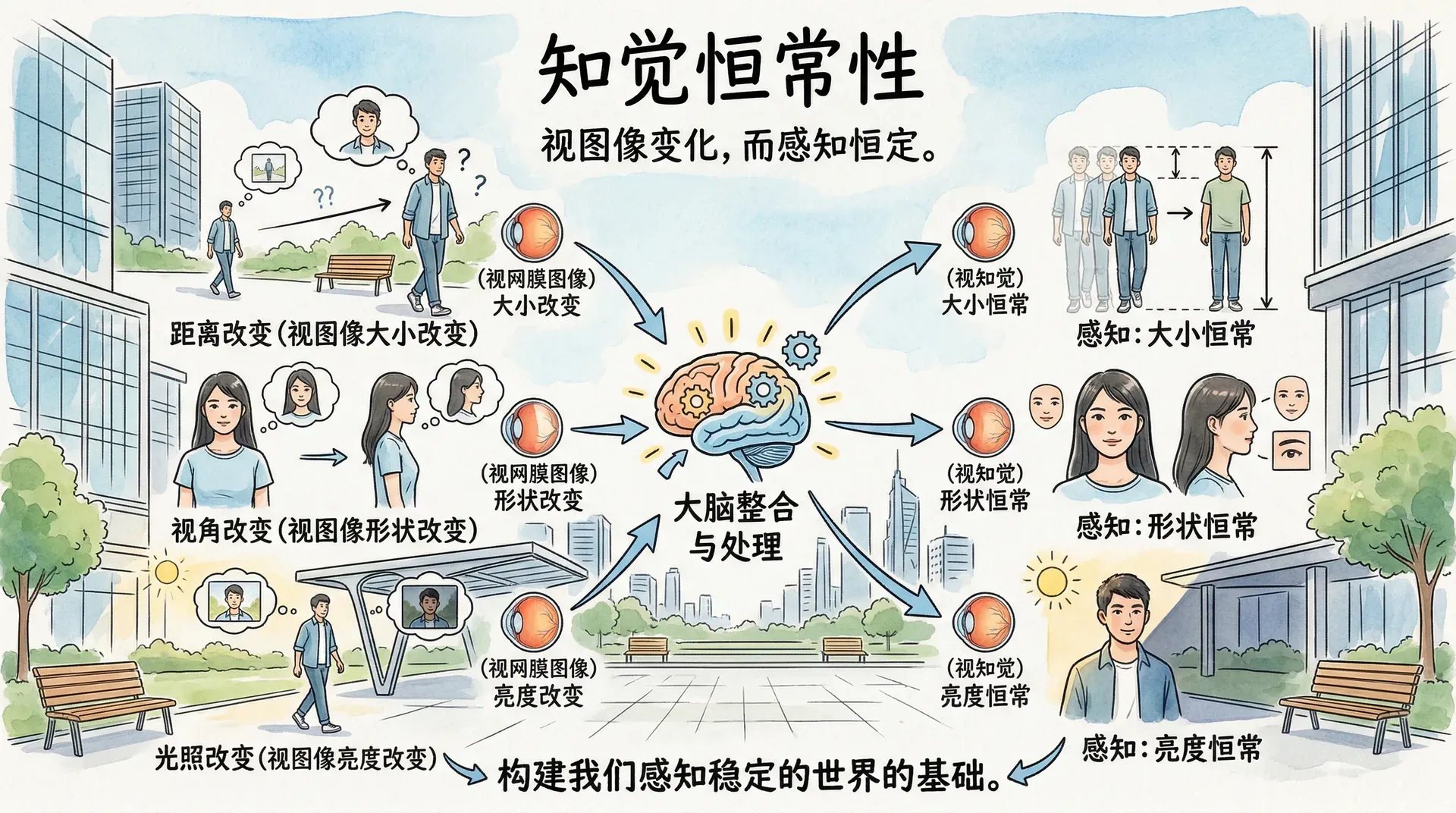 朋友向我们走近时并不会在眼中“变大”,转身时也不会“变形”,走到阴影下也不会“变暗”。尽管物体的视网膜图像随视角、距离、光照的变化而改变,我们仍能将其知觉为同一个稳定的物体。这种能力被称为知觉恒常性,是我们感知世界稳定性的重要基础。