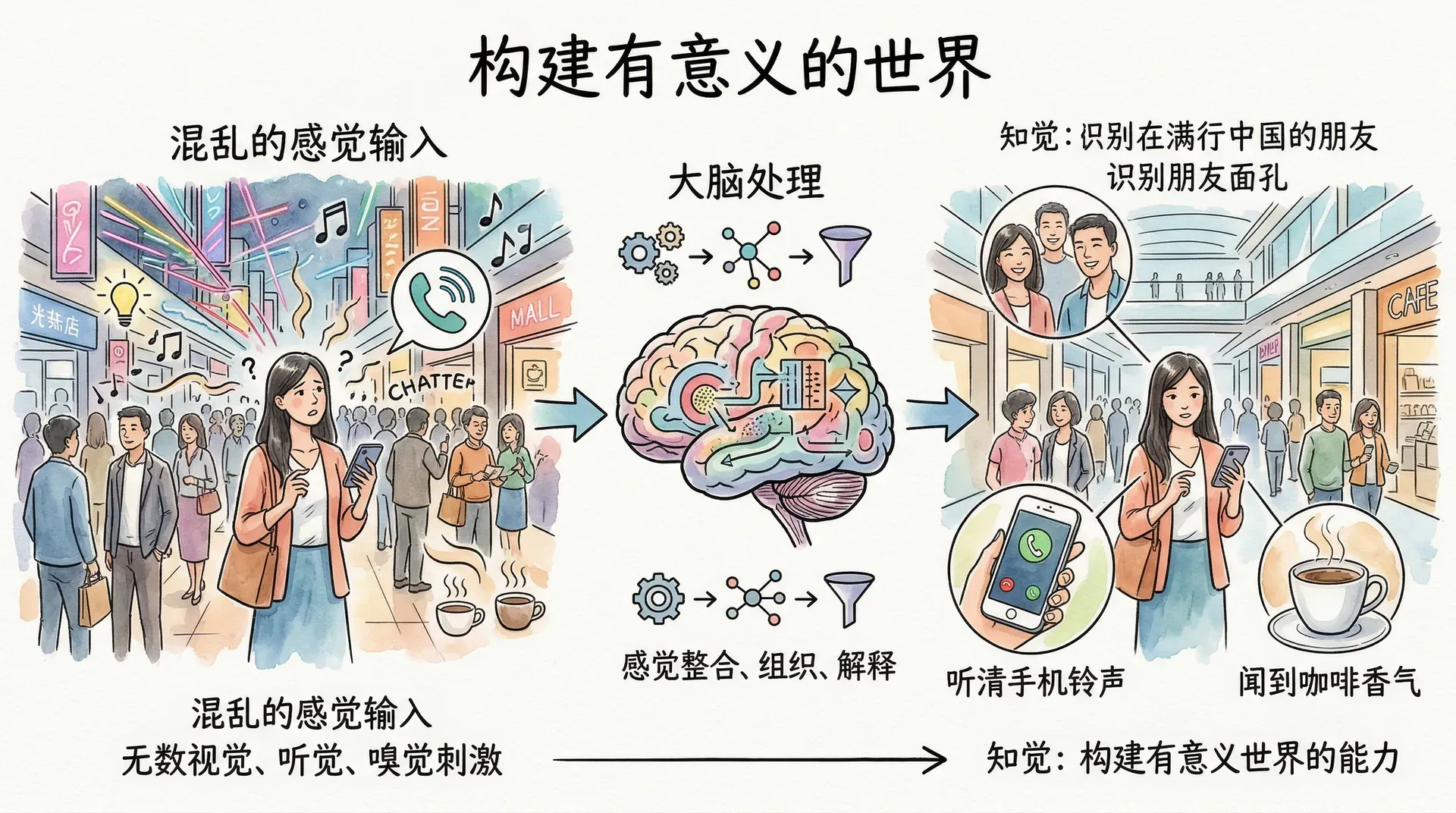 知觉是在感觉基础上,对感觉信息进行选择、组织和解释的心理过程。如果说感觉是“接收”,知觉就是“理解”。两个过程紧密相连,却有本质区别。