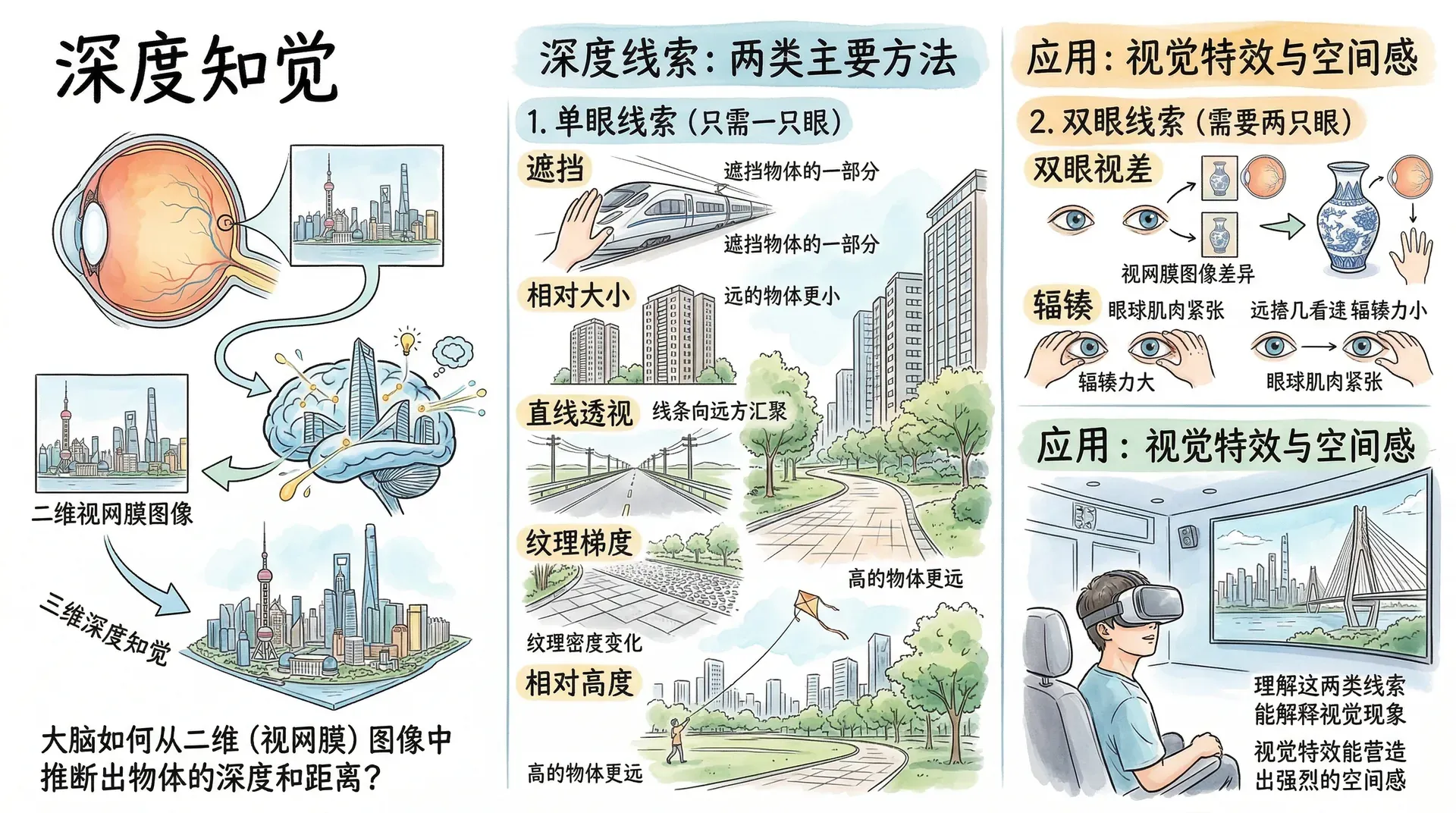我们生活在三维世界中,但视网膜只能接收二维的光学图像。大脑如何从二维的视网膜图像中推断出物体的深度和距离?深度知觉依赖于两类线索:单眼线索和双眼线索。理解这两类线索,有助于解释许多视觉现象,也能解释为什么某些视觉特效能营造出强烈的空间感。