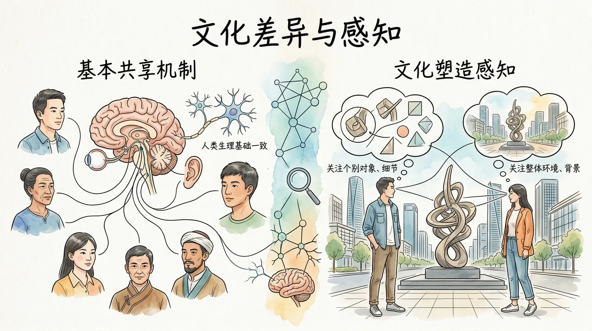 跨文化知觉差异并不意味着不同文化的人生活在完全不同的知觉世界中。颜色知觉、深度知觉、面孔识别等基本知觉能力是人类普遍共享的,文化的影响更多体现在注意的分配、解释的偏好和意义的建构上。