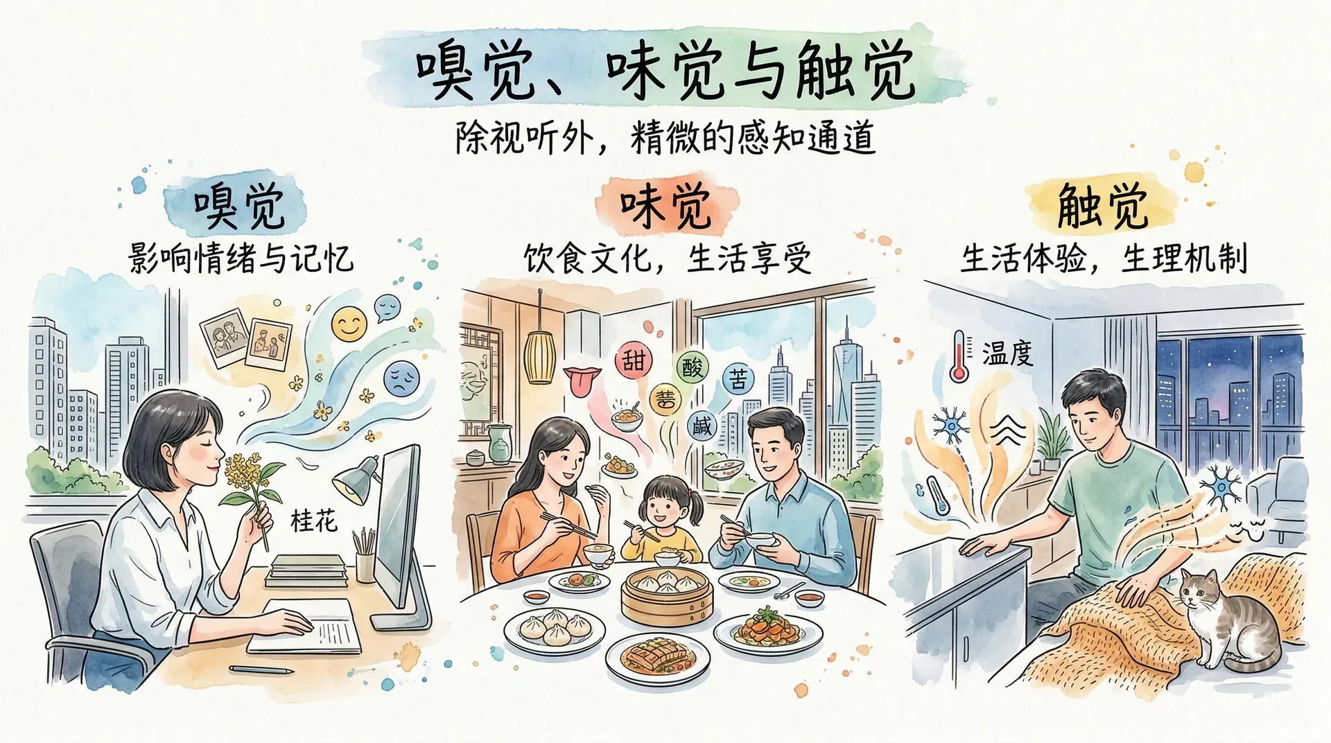 除视觉和听觉外,嗅觉、味觉和触觉同样是人类感知世界的重要通道。这三种感觉系统各有独特的生理机制,在日常生活和文化传承中扮演着不可替代的角色,也常常以微妙的方式影响着我们的情绪与记忆。