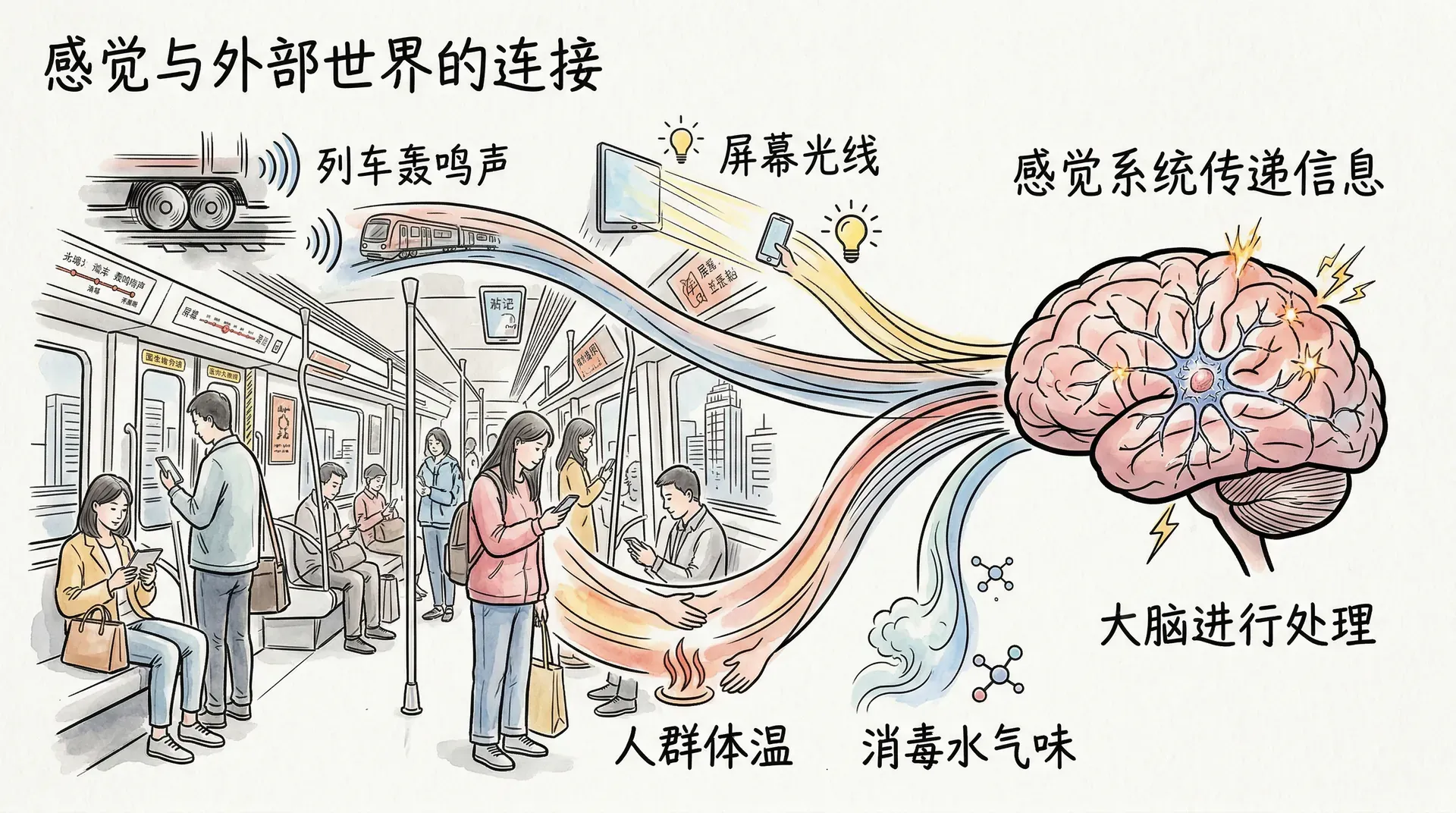 繁忙的地铁车厢里,周围世界正通过各种感觉通道涌入大脑:列车轰鸣声、屏幕的光线、人群的体温、空气中的消毒水气味……感觉系统将这一切信息传递给大脑进行处理。感觉是心理学最基础的研究领域,是人类认识世界的第一道门户。