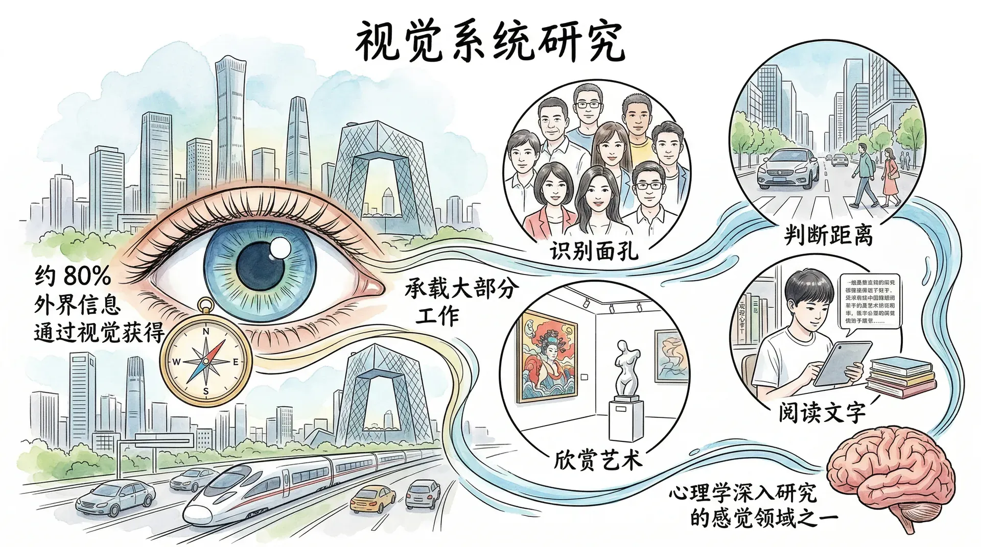 视觉是人类最重要的感觉系统,约 80% 的外界信息通过视觉获得。从识别面孔到判断距离,从欣赏艺术到阅读文字,视觉系统承载了人类认识世界的大部分工作,也是心理学研究中最为深入的感觉领域之一。