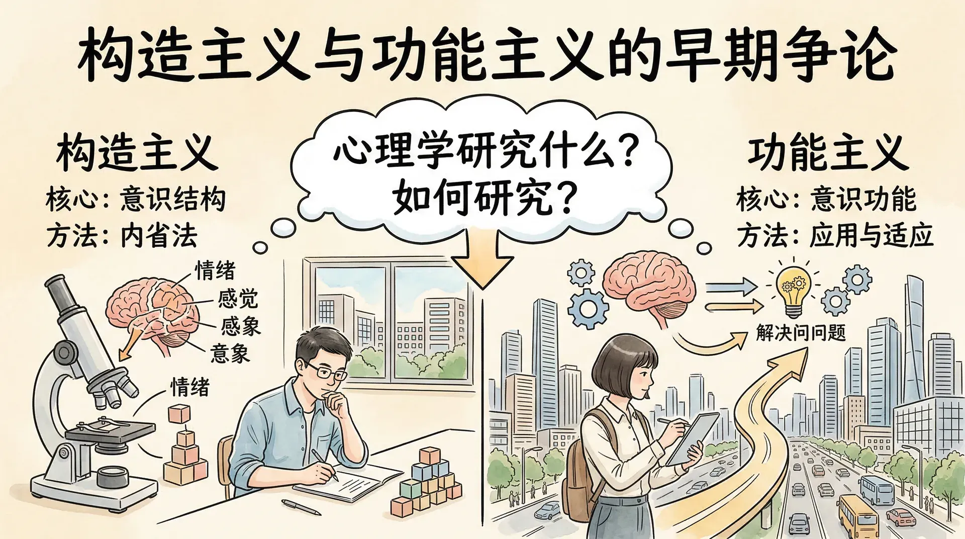 在科学心理学诞生的初期,学者们面临着一个根本性的问题:心理学究竟应该研究什么,又应该如何研究?围绕这些问题,形成了心理学史上最早的两大理论流派——构造主义和功能主义。这两个流派从不同的角度切入心理学研究,它们之间的争论不仅推动了心理学理论的发展,也奠定了现代心理学研究的基本框架,并深刻影响了后来所有主要心理学流派的形成方式。