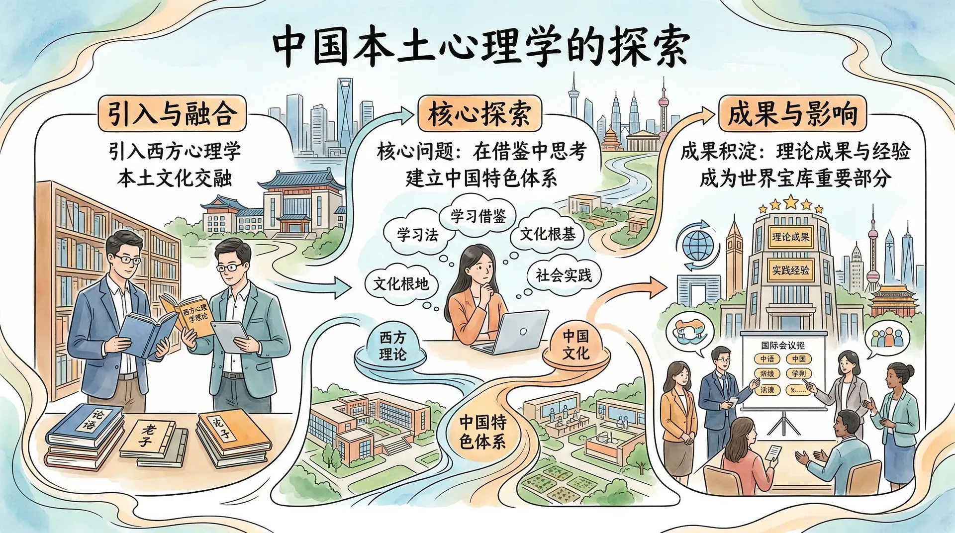 著名心理学家杨国枢曾说:“心理学的本土化不是要建立一个封闭的体系,而是要在吸收人类共同智慧的基础上,发展出既有普遍意义又有文化特色的心理科学。”中国心理学的发展,正是在这种理念的指引下,走出了一条既立足本土、又面向世界的道路。